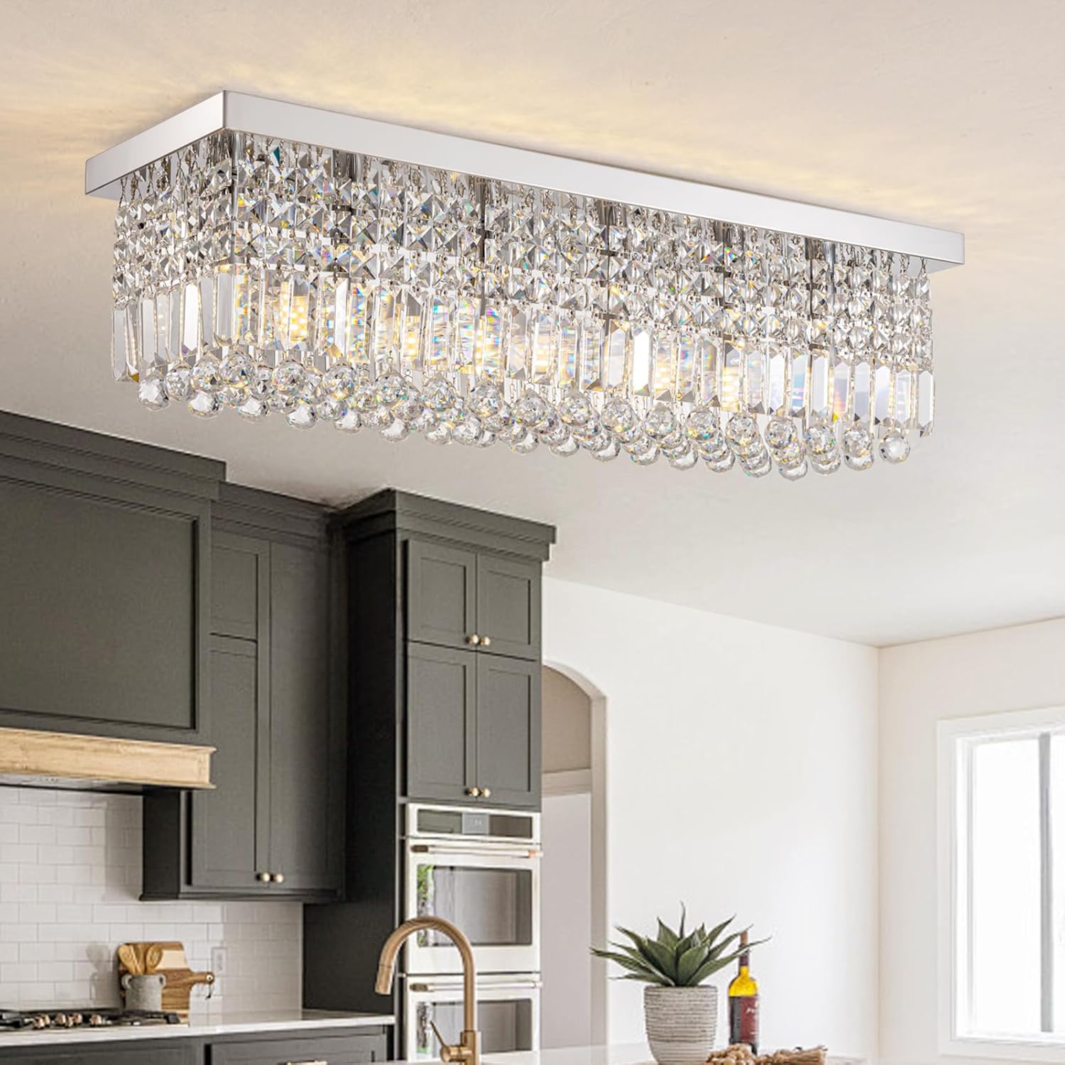 Rectangular Chandelier, Flush Mount Rectangle Chandelier Modern K9 Crystal Chandeliers Light Fixture, 6-Lights Raindrop Crystal Pendant Ceiling Light for Dining Room Bedroom Bar Club L31.5 Inch