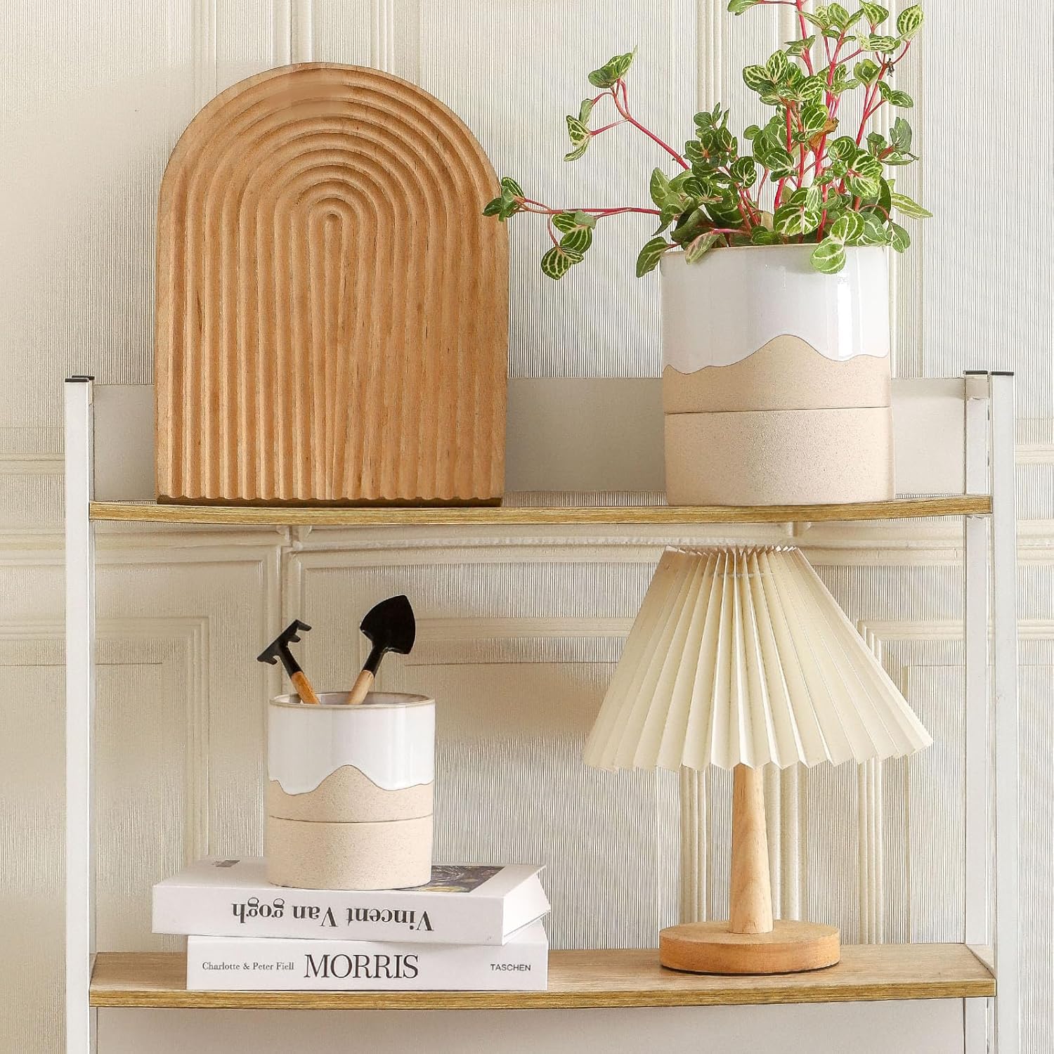 Nihow Self Watering Plant Pot: 4.5 Inch Ceramic Planter with Drainage Hole & Water Storage Plus for Indoor & Outdoor Plants - Cylinder Flower Pot for Herbs/Violets - White & Nature