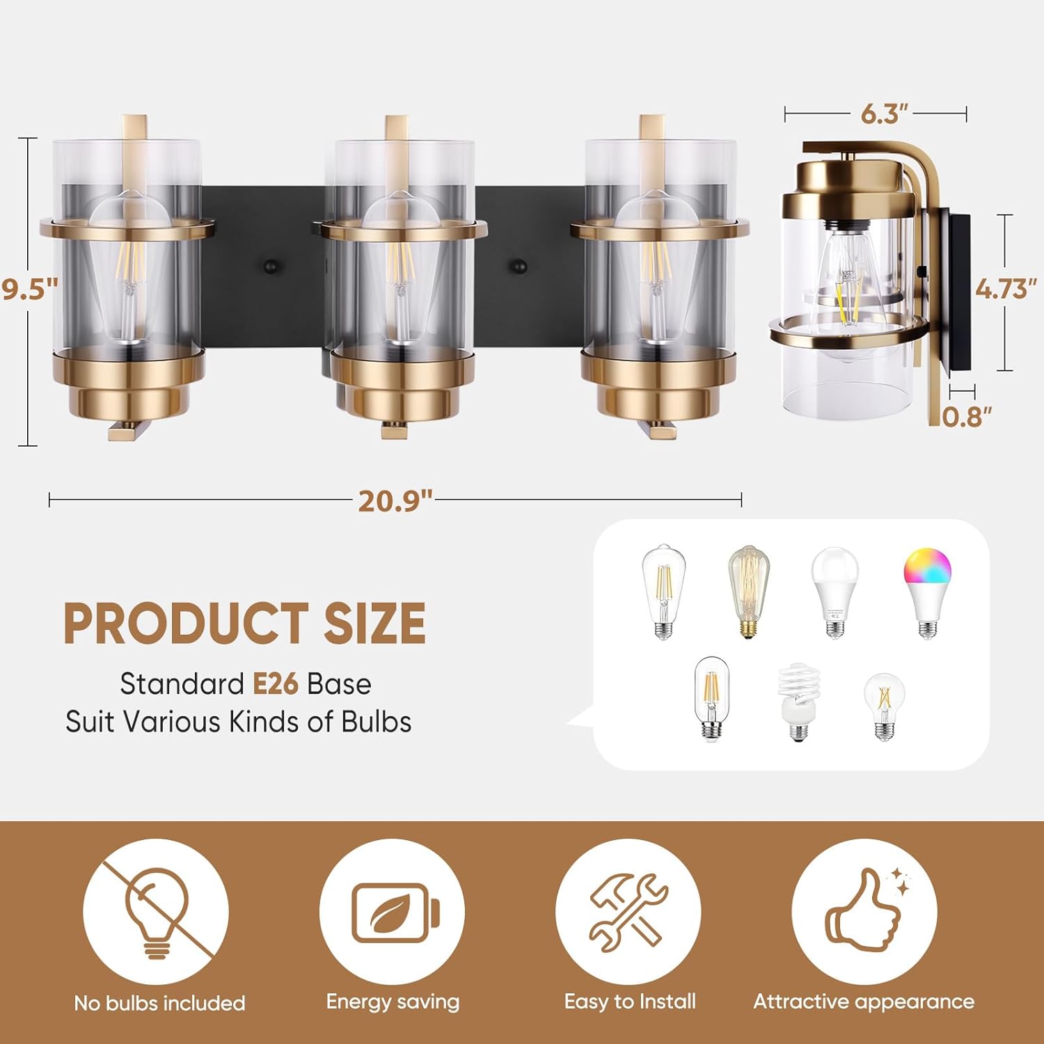 - Medium Base Socket:This modern bathroom vanity light suggest to take maximum 60 watt Medium base bulbs (incandescent, CFL or LED compatible). Bulbs not included.