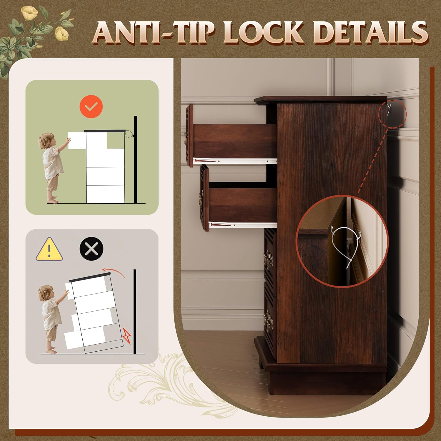 - 🏡【Safe and Sturdy】The dressers & chests of drawers are made of durable engineered wood, featuring a thick tabletop that can support heavy items. Sloping edges and widened legs improve stability. An anti-tipping device ensures child safety by preventing wobbling and tipping.