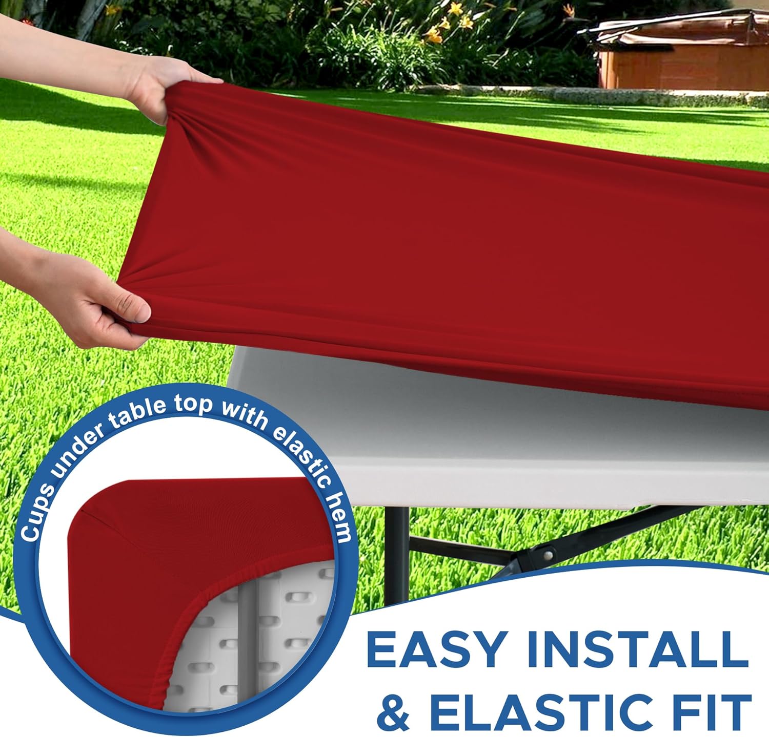 Fitted Tablecloth for 8 Foot Rectangle Tables-4 Pack Red Elastic Outdoor Picnic Table Cover-Spandex Stretch Folding Table Cloths 8ft for Camping Dining Room Patio Kitchen Banquet Party
