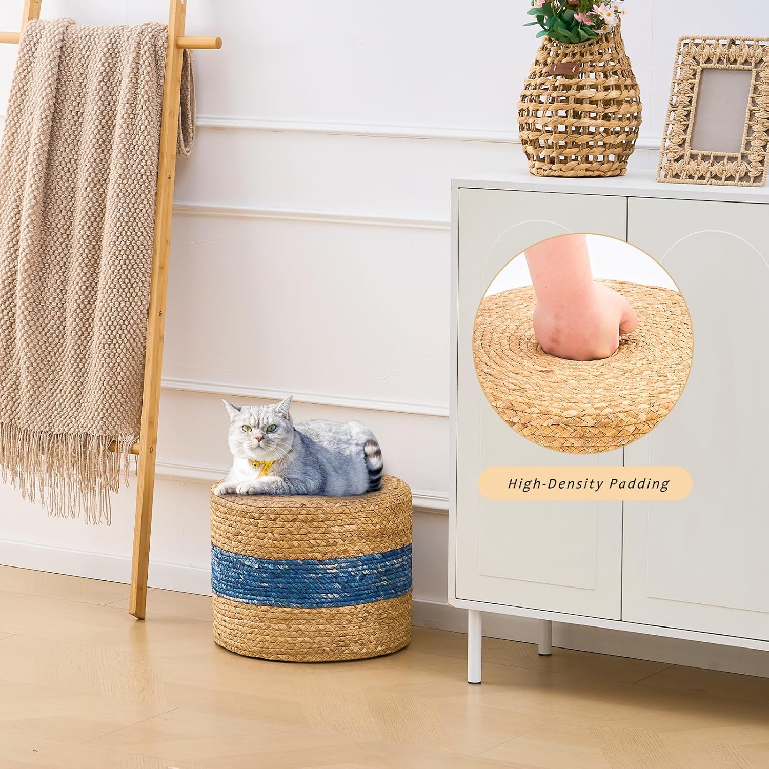 Handwoven Water Hyacinth Ottoman Pouf, Round Outdoor Footstool with Sturdy Frame, No Assembly Needed, Boho Accent Stool for Indoor & Outdoor Use – Patio, Balcony, Living Room (Blue)