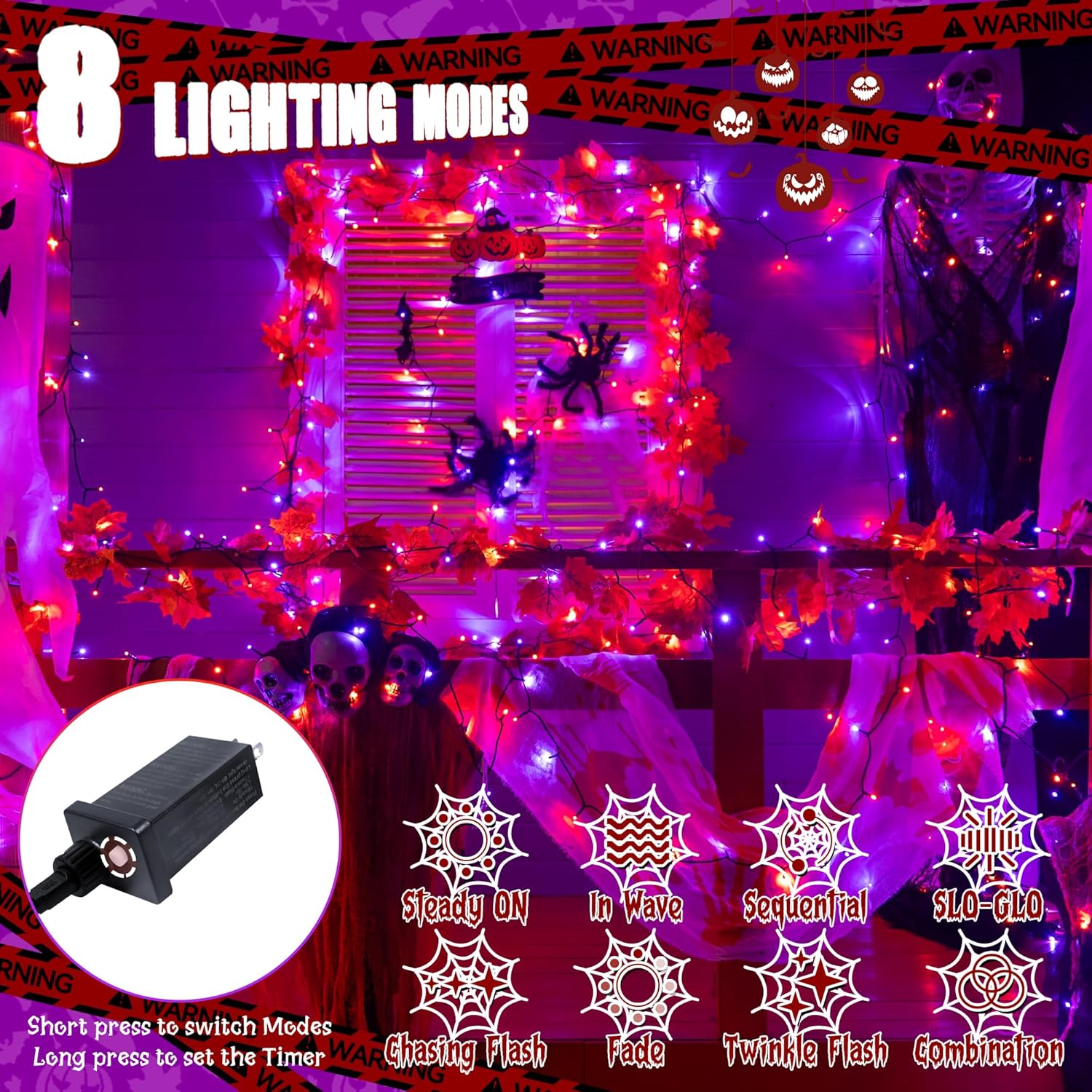 - 8 Lighting Modes: Steady on, in wave, sequential, slo-glo, chasing flash, fade, twinkle flash, combination. Simply short press the round button on the adapter to switch between different modes and create a halloween atmosphere. Make your house the scariest in the neighborhood
