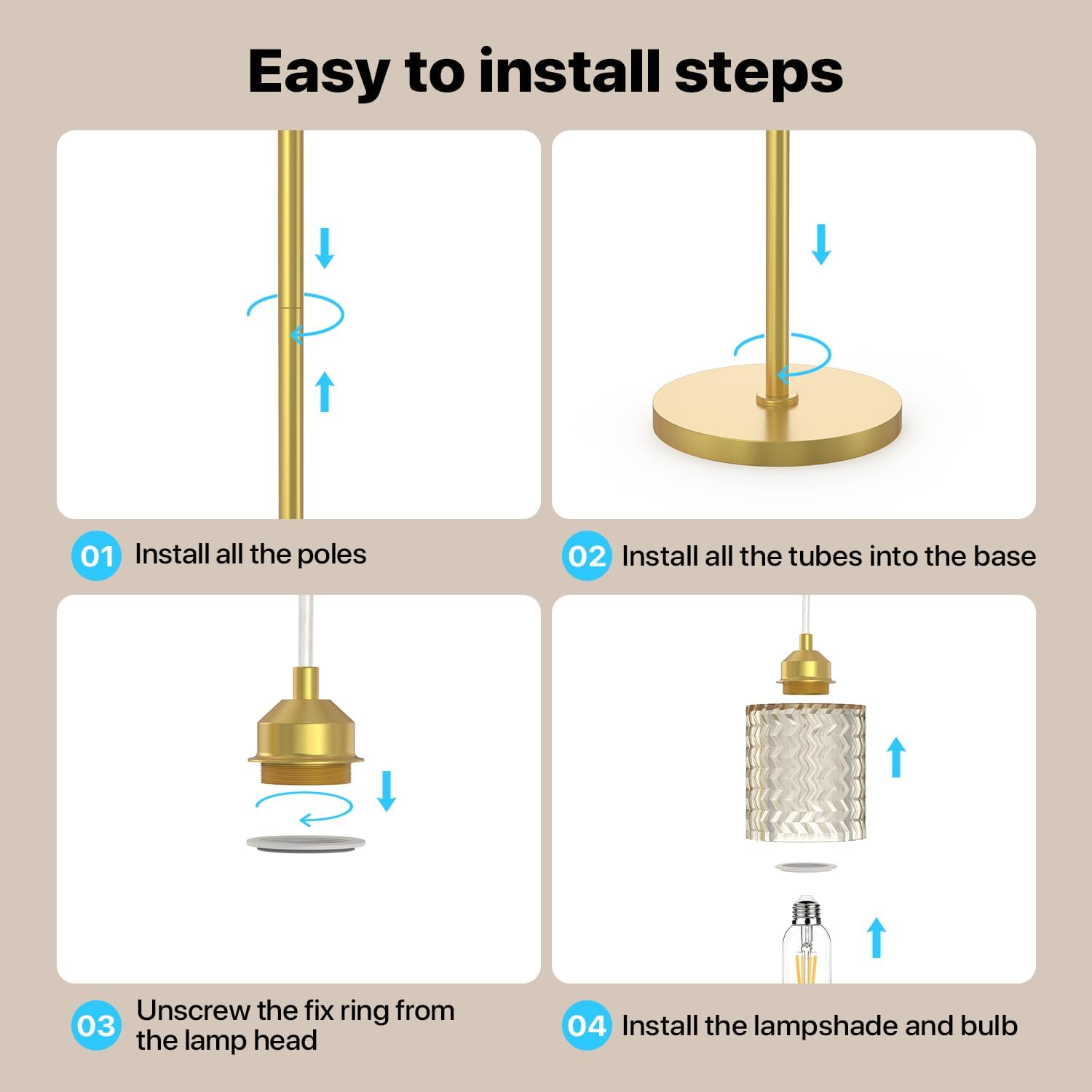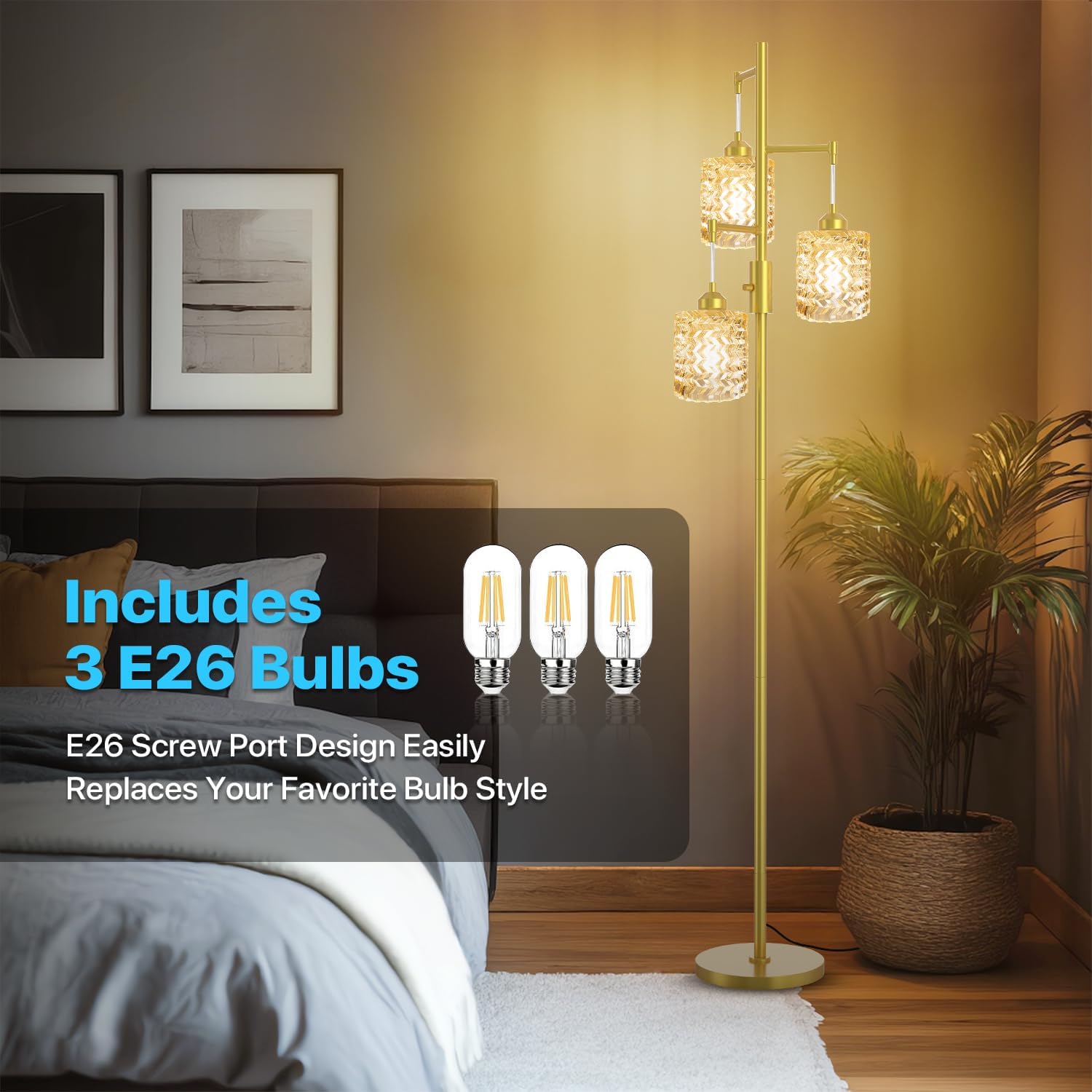 - Ready-to-Use Convenience: This gold crystal floor lamp comes with 3 matching E26 bulbs—no extra purchase needed. Simply unbox, install, and start using it right away. It saves you the hassle of choosing bulbs, so you can enjoy the beautiful glow of this floor lamp sooner