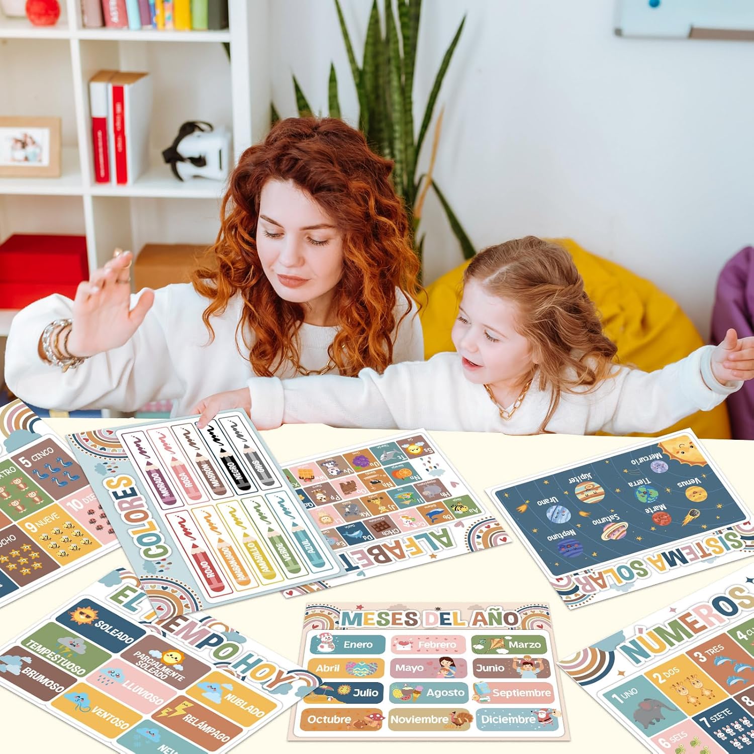 - Educational placemat set for kids: This set includes 6 boho Spanish educational placemats for kids featuring themes like colors, alphabet, maps, numbers, weather, and the solar system. These Spanish toddler plastic placemats are designed to introduce children to Spanish vocabulary while they learn important subjects. Ideal for preschoolers and elementary school children, they turn mealtime into an opportunity for bilingual learning in Spanish.