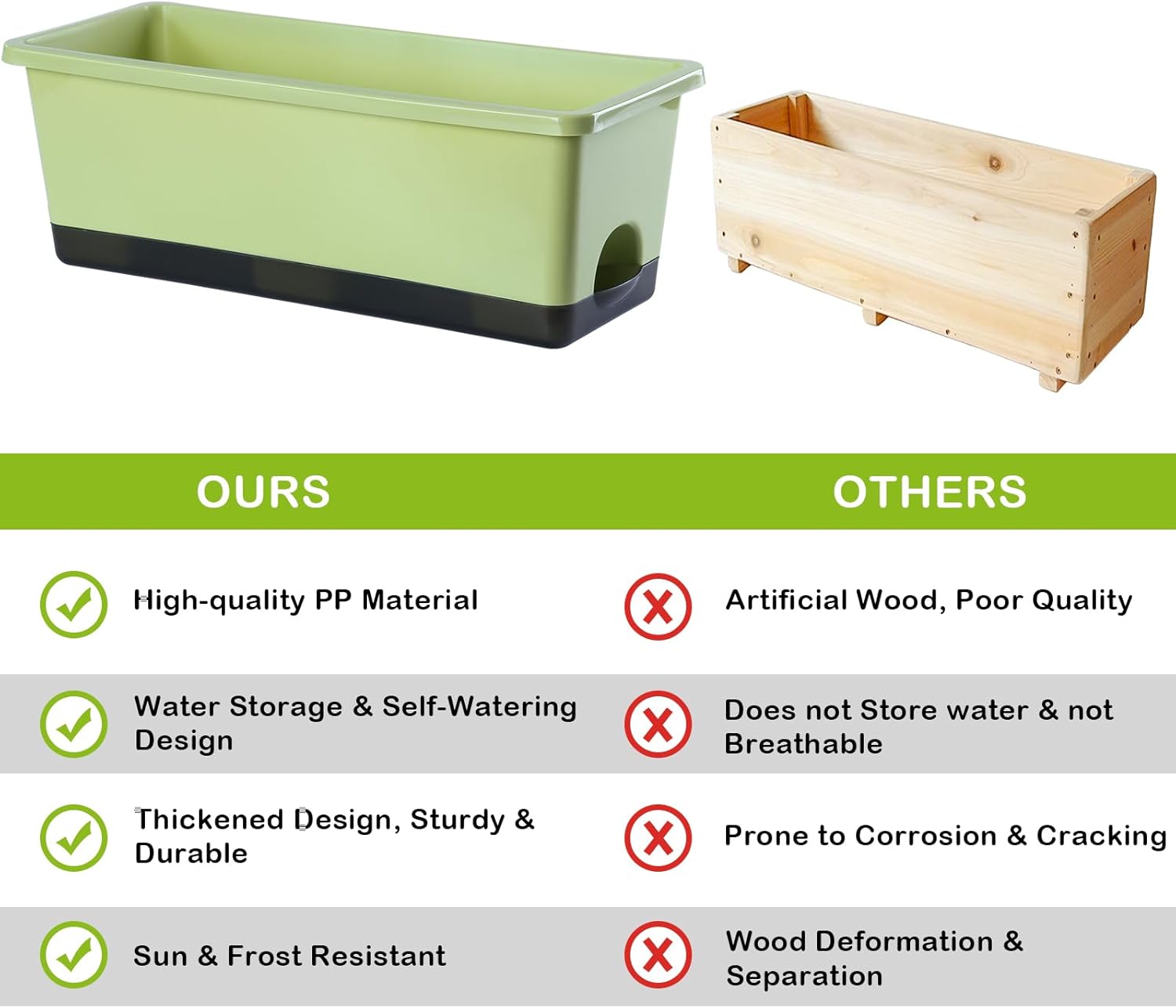 - 【Premium & Durable】The planter pots are made of high quality PP material and has been thickened to bear up to 300KG (660LB). This window box planter is sturdy, wear-resistant and durable. It can be exposed to light, wind, and sunlight for long periods of time, with a lifespan of decades. It is an excellent planter box for both indoor and outdoor.