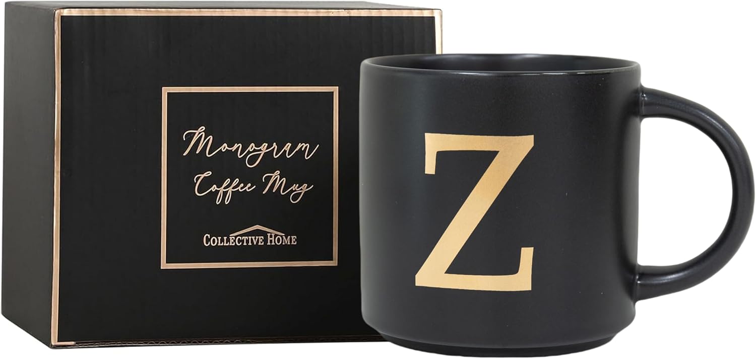 COLLECTIVE HOME - Monogram Ceramic Mugs, 15 oz Golden Initial Black Coffee Cups, Elegant Alphabet Tea Mugs, Elegant Personalized Mug with Gift Box, Unique Mug with Double Side Capital Lette (Z)
