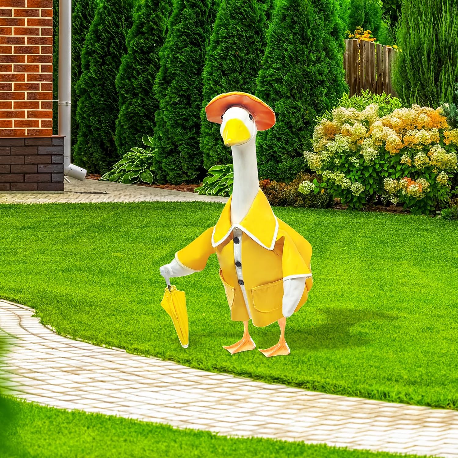 - Unique Style, One-of-a-Kind Look:The bright yellow color contrasts beautifully with black-and-white buttons, while the mini umbrella turns your goose into a little rain-day adventurer. It’s the perfect addition of charm and whimsy to your lawn, garden, or front porch