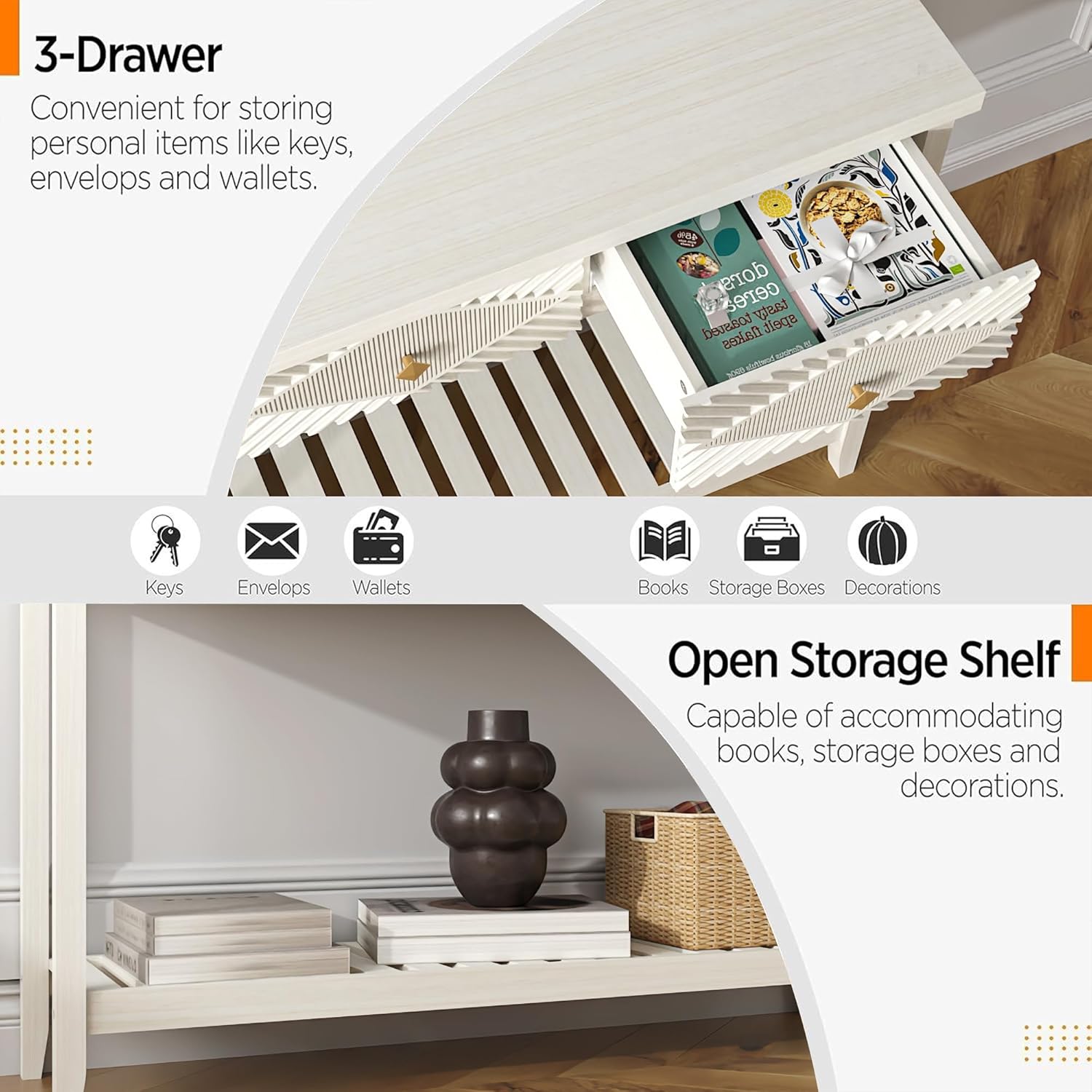 - Reasonable Storage Space: Boasting great storage capacity, this entryway table comprises 3 smooth drawers, 1 spacious tabletop and an ample bottom storage shelf. Daily-use items for going out such as sunglasses, keys, masks, power bank, umbrella and shoes can all be accommodated in order