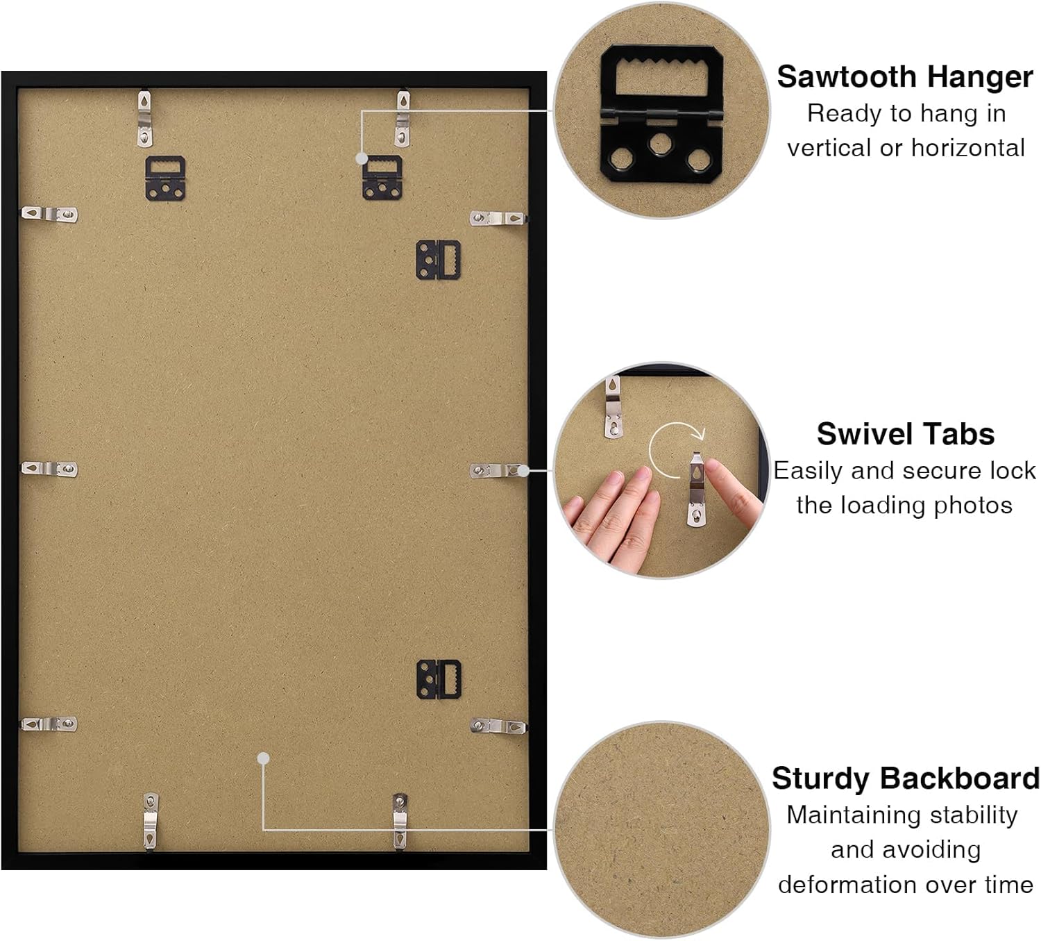 - Versatile Design: This black frame accommodates 12x18 photos with mat or 16x24 without mat. The mat is slightly reduced by 0.5 inches to keep photos in place. Suitable for both horizontal and vertical display, it complements various decor styles