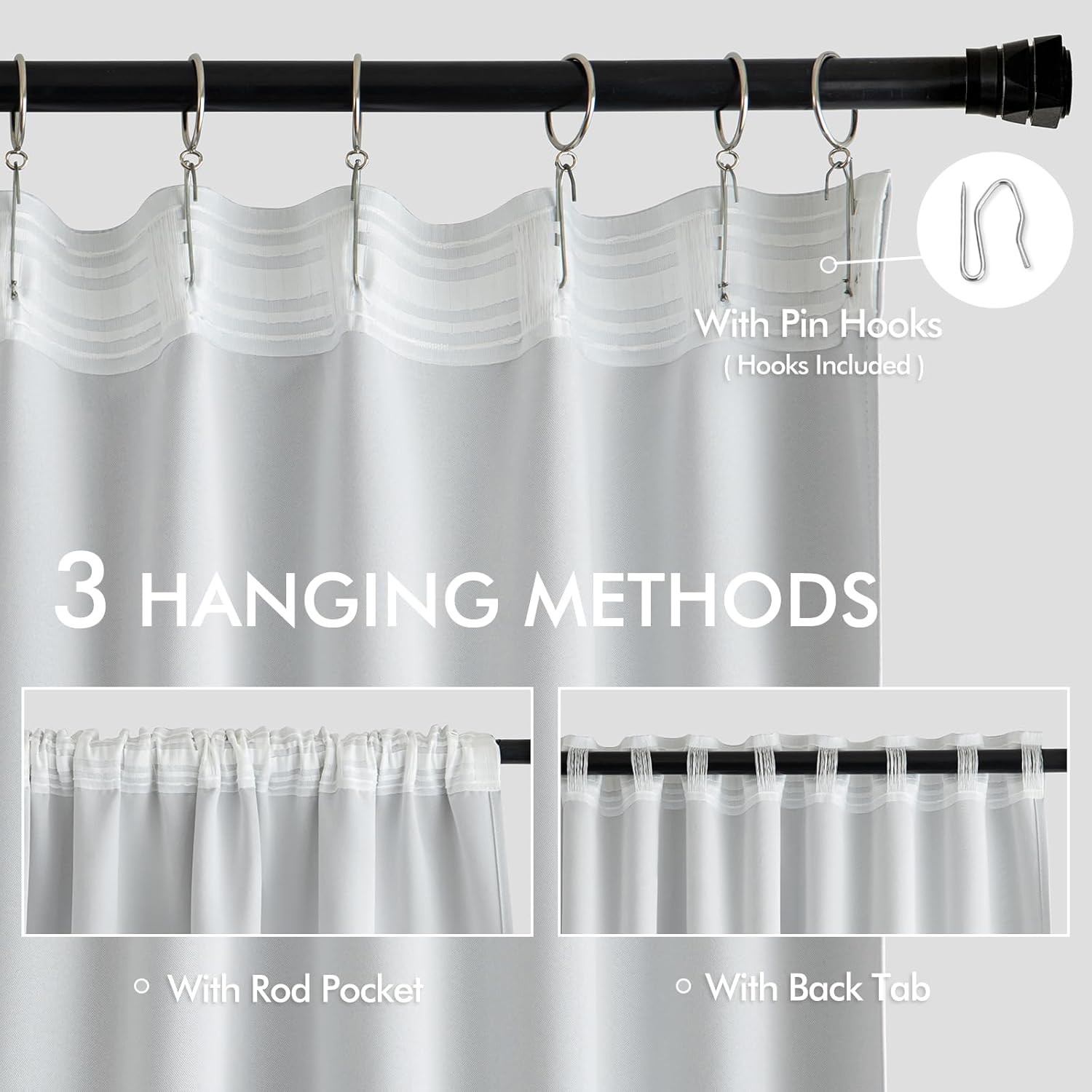 - MULTIPLE HANGING OPTIONS: Each curtain panel features a 3-in-1 top style design: Rod Pocket, Back Tab and Pinch Pleat. The Back loop (2.3 "long) and rod pocket (3.1" long) fit most standard rods. Curtains also can be hung with clip rings or different type of hooks. We will give away 20 pin hooks for each pair of curtains for your convenience (rings won't be included). 3 ways to meet your various needs.