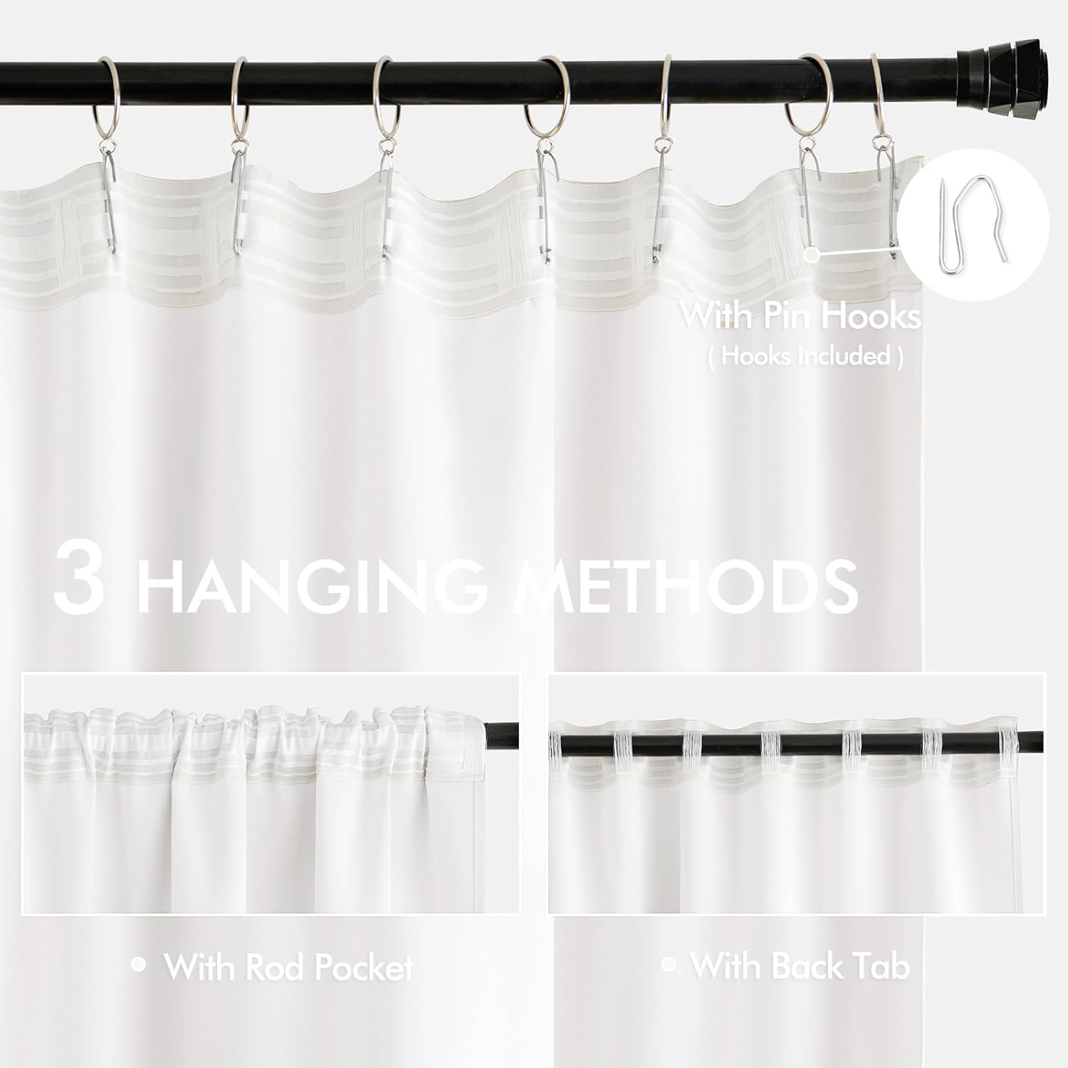 - MULTIPLE HANGING OPTIONS: Each curtain panel features a 3-in-1 top style design: Rod Pocket, Back Tab and Pinch Pleat. The Back loop (2.3 "long) and rod pocket (3.1" long) fit most standard rods. Curtains also can be hung with clip rings or different type of hooks. We will give away 20 pin hooks for each pair of curtains for your convenience (rings won't be included). 3 ways to meet your various needs.