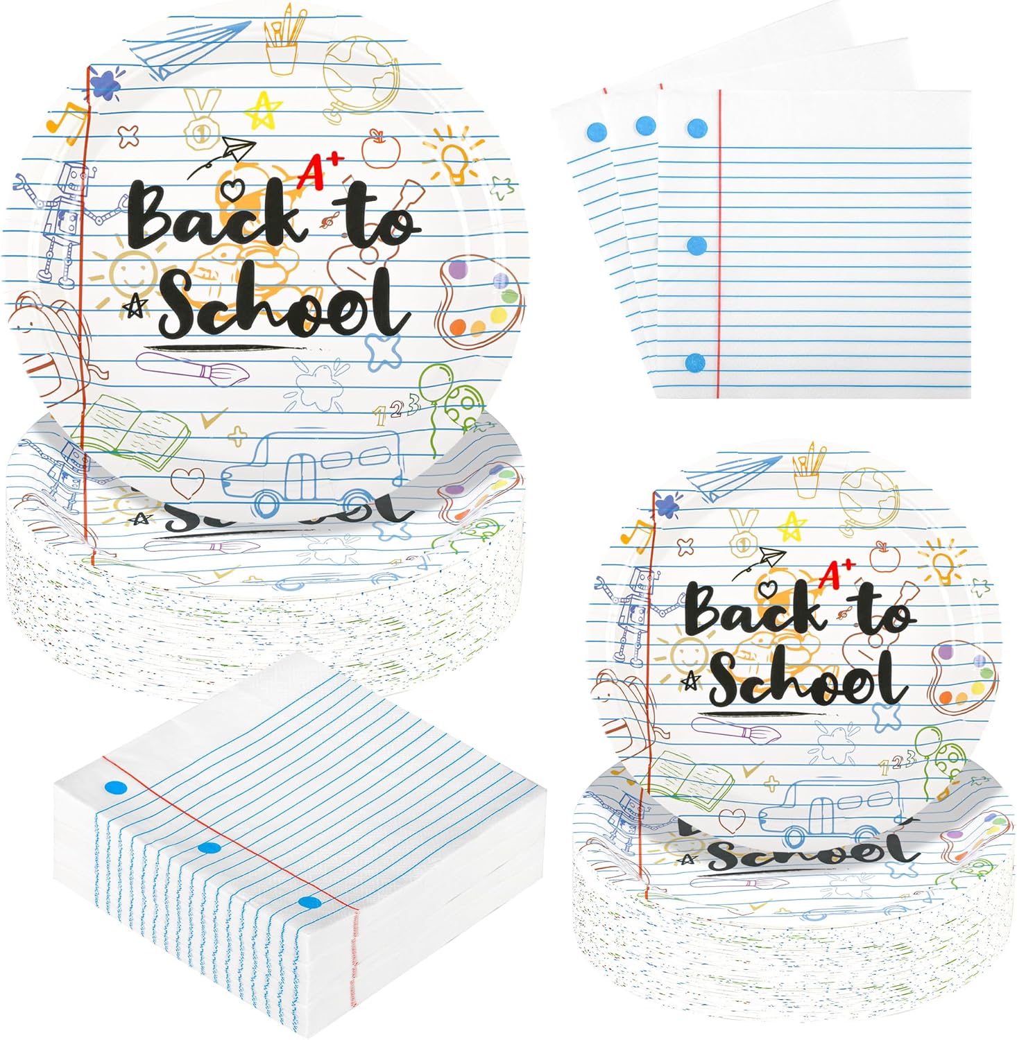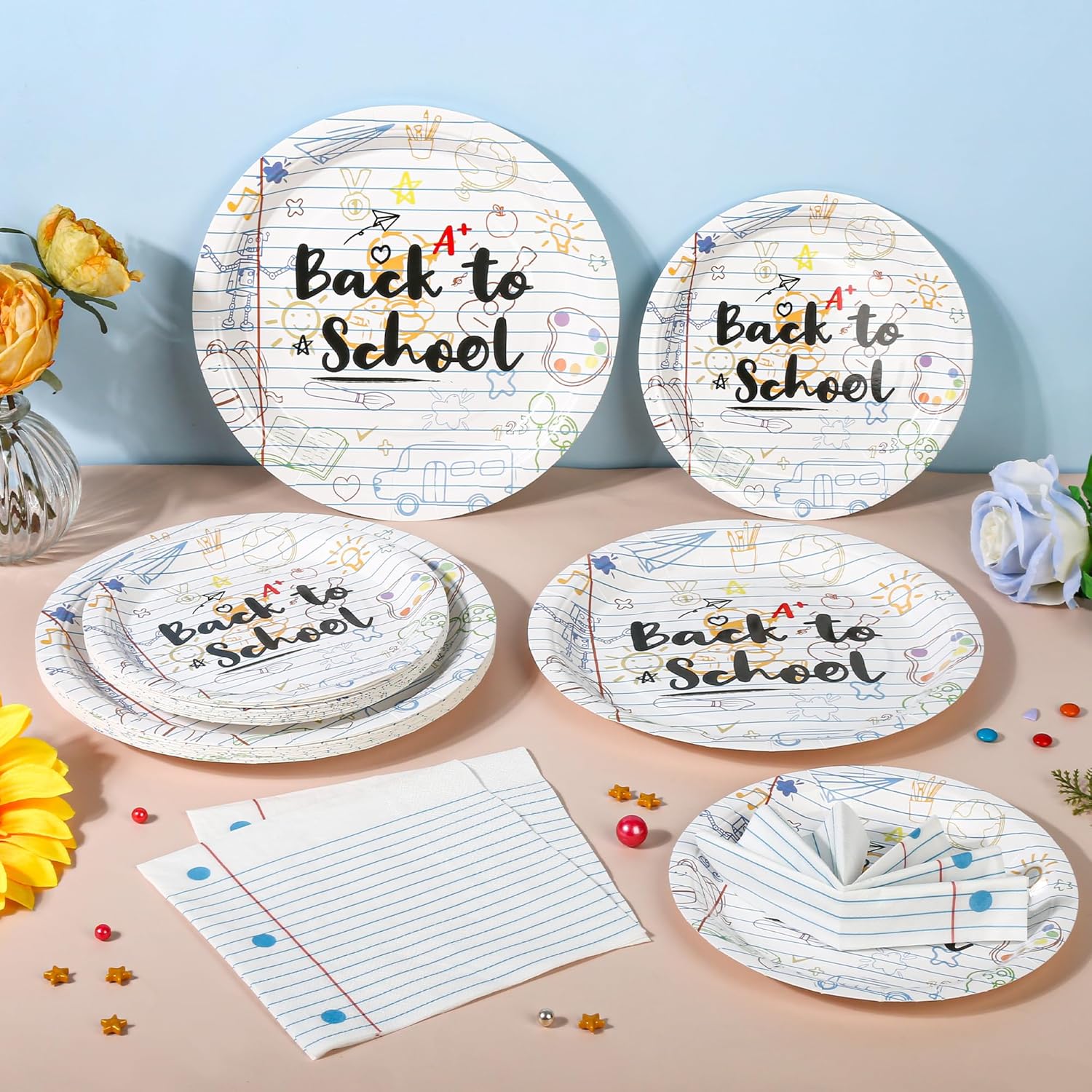 - UNIQUE DESIGN----Complete set with 9" back to school paper plates* 50,7" school themed plates* 50,6.5" notebook napkins *50. It’s the charming back to school decor to capture the energy of the new academic year. Great for first day of school party decorations, these school paper plates and napkins add a touch of classroom charm to any table. Nice design, teacher-approved!