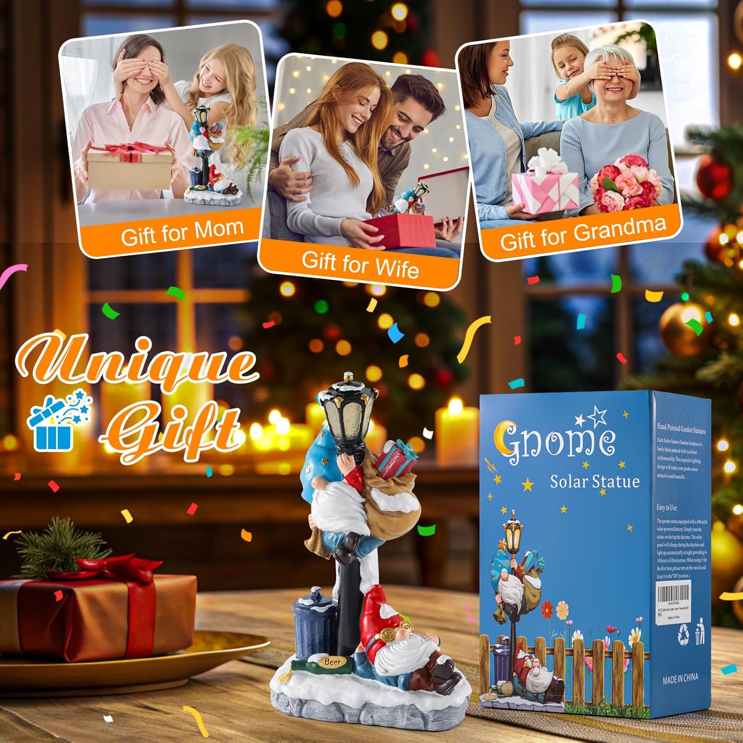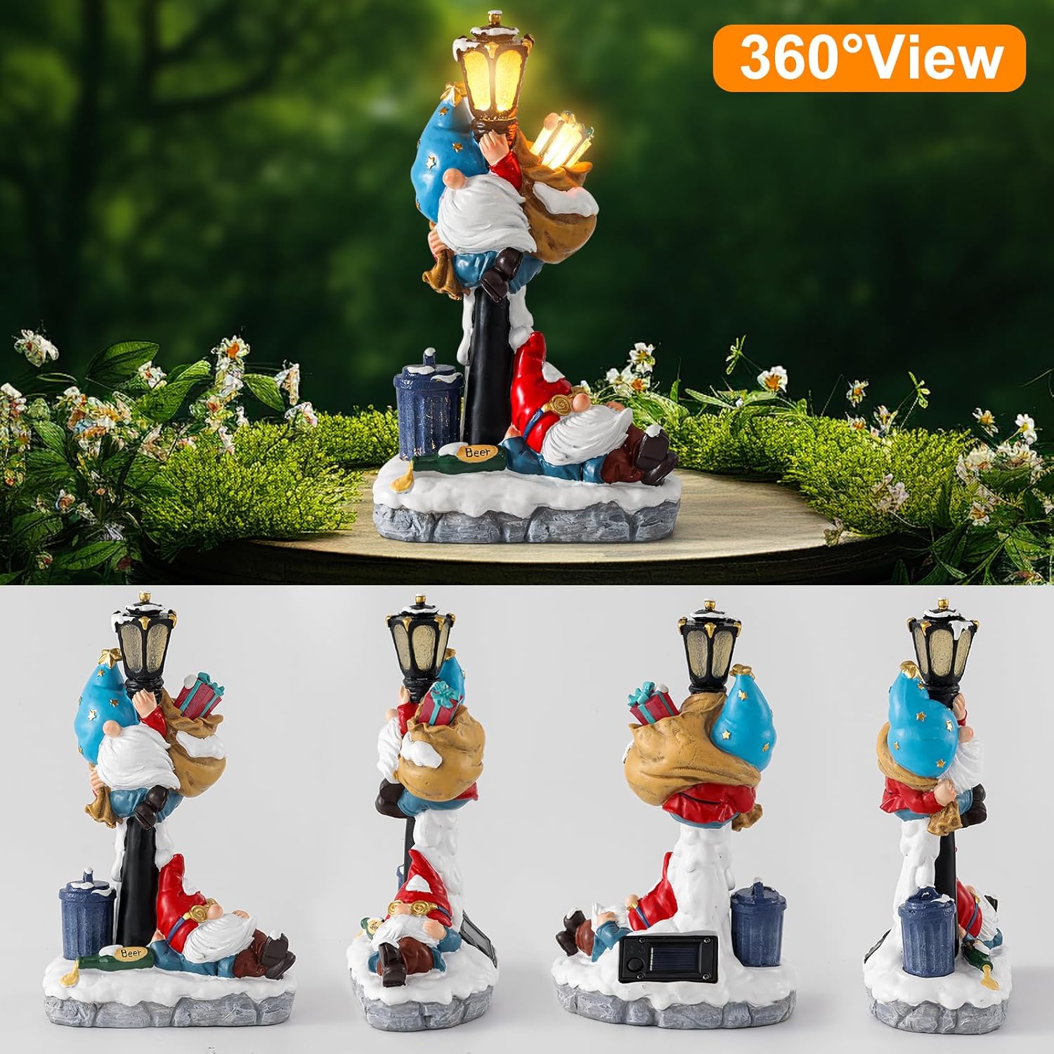 - Adorable Gnome Design: Two whimsical gnomes stay under in street lamp in a snowfall winter day. one gnome carrying a gift and climbed towards a street lamp,while another gnome drunk from holiday cheer.Equipped with 3 LED lights, it adding a lovely glow in your garden on a winter wonderland