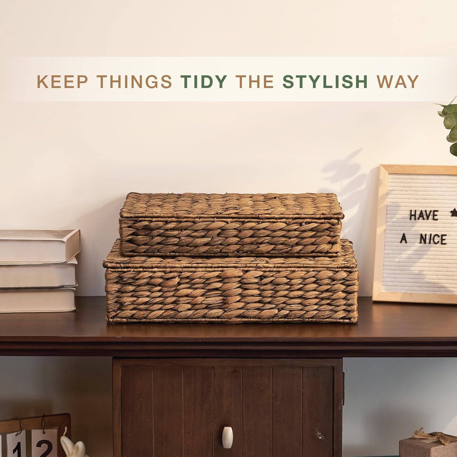 - Versatile Storage Solution: Use these wicker storage baskets with lid to neatly organize mail, office supplies, remote controls, chargers, data cables, makeups, socks, or underwear, keeping your essentials within easy reach but out of sight.
