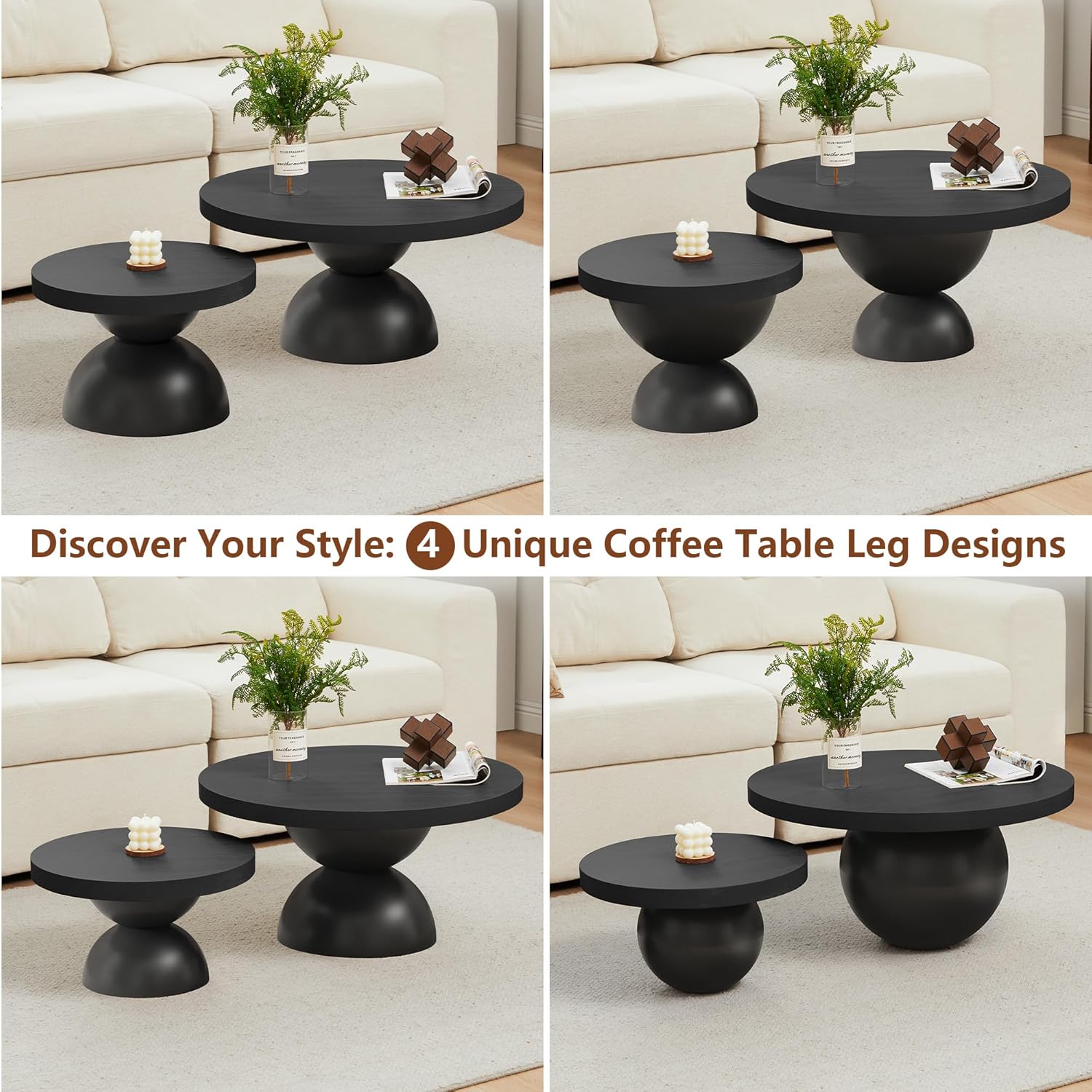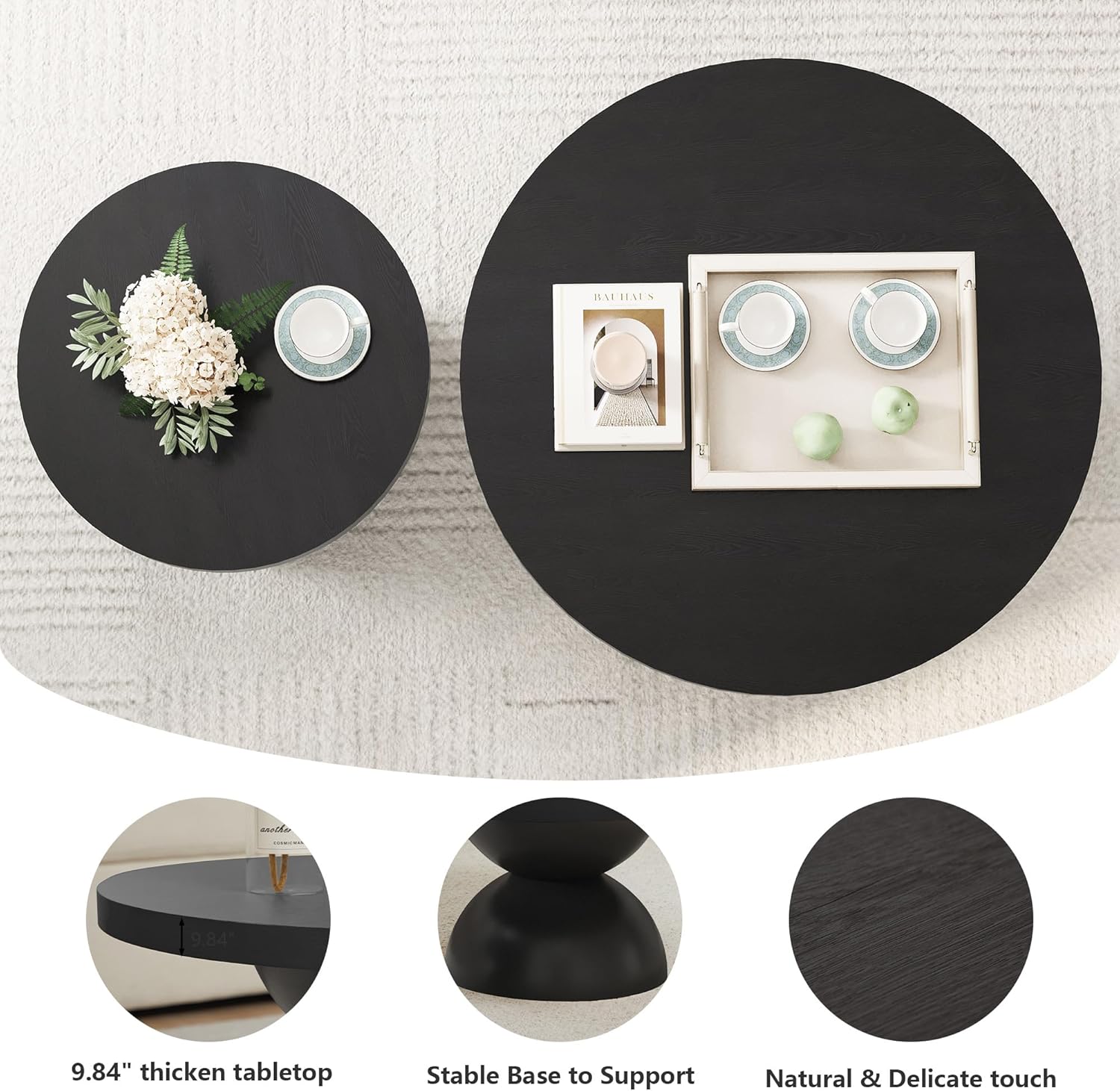 Solid Wood Round Nesting Coffee Table Set of 2, Circle Accent Tables with Unique Semi-Circular Legs, Mid Century Modern Side End Table Set for Small Space Living Room Office (Black)
