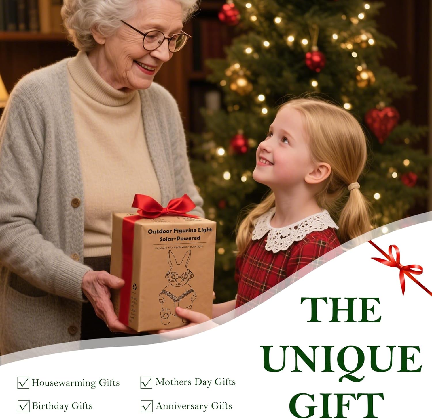 - Whimsical & Adorable Design: Meet your new favorite garden companion! A sweet rabbit sits thoughtfully, cradling an open book, adorned with yellow solar-powered glasses. As dusk falls, its round glasses emit a soft, warm glow.