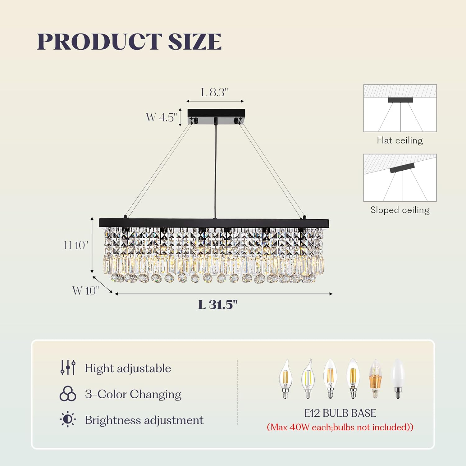 - 6-LIGHT DINING ROOM CHANDELIER: Requires 6 x E12 base bulbs (๐๐๐ฑ ๐๐๐ ๐๐๐๐ก, ๐๐ฎ๐ฅ๐๐ฌ ๐ง๐จ๐ญ ๐ข๐ง๐๐ฅ๐ฎ๐๐๐) to beautifully illuminate your space. Compatible with 3 color changing E12 LED bulbs, you can switch between warm light (3000K), neutral light (4500K), and cool light (6000K) to match any mood. Fully dimmable when used with dimmable bulbs and a compatible ๐๐ข๐ฆ๐ฆ๐๐ซ ๐ฌ๐ฐ๐ข๐ญ๐๐ก (๐ง๐จ๐ญ ๐ข๐ง๐๐ฅ๐ฎ๐๐๐), this kitchen island chandeliers offer customized lighting from cozy dinners to lively gatherings.