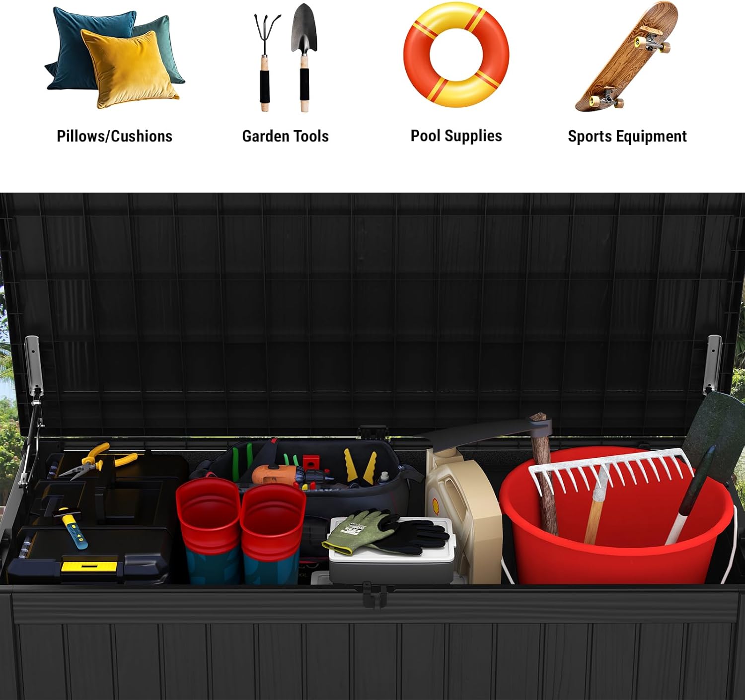 - 【Smooth & Secure Operation】- Designed with dual side hydraulic hinges, the lid opens effortlessly and stays in place, allowing easy access to your items, the slow closing mechanism ensures safe operation for family members, while the lockable lid (lock not included) adds an extra layer of security for your outdoor essentials