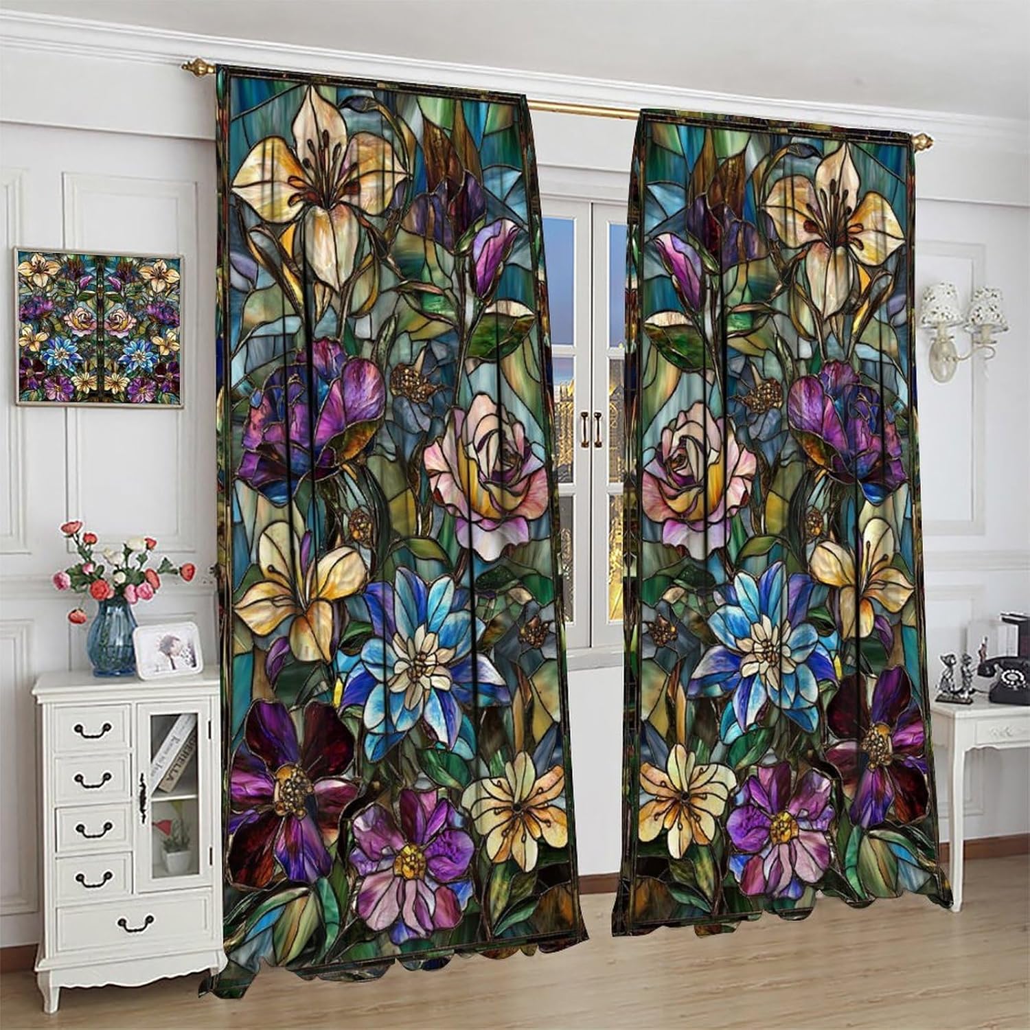 Stained Glass Curtains,Retro Colored Glass Flowers Art Home Decor Drapes for Bedroom Living Room Kitchen Window Treatment 2 Panels Set Total Size 52" W X 84" L Inch