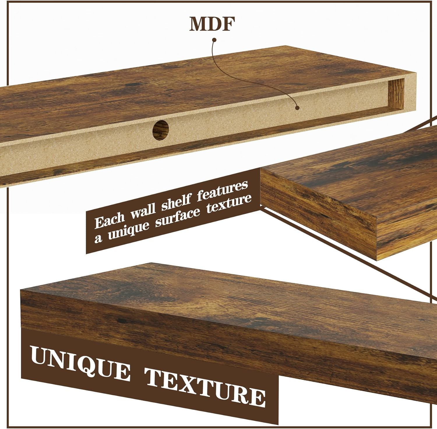 - GREAT FOR ANY ROOM: Our wood floating shelves are made of MDF with a frosted surface texture for a mordern feel that blends perfectly into a variety of different scenes; Having this large floating shelf not only for its decoration effect, but also for its high practicality; It can be used for organizing all household rooms, such as bedroom, living room, study, toilet, cloakroom, even kitchen and warehouse