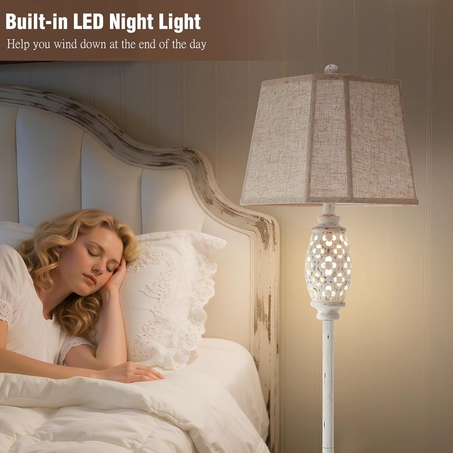 - 【Distressed Cream White Floral Elegance】Crafted from resin with a hand-finished antique cream white patina, this lamp features intricate hollow-carved blossoms that glow softly. The timeless fusion of rustic charm and delicate floral artistry creates a vintage-inspired centerpiece for farmhouse or cottage-style spaces.