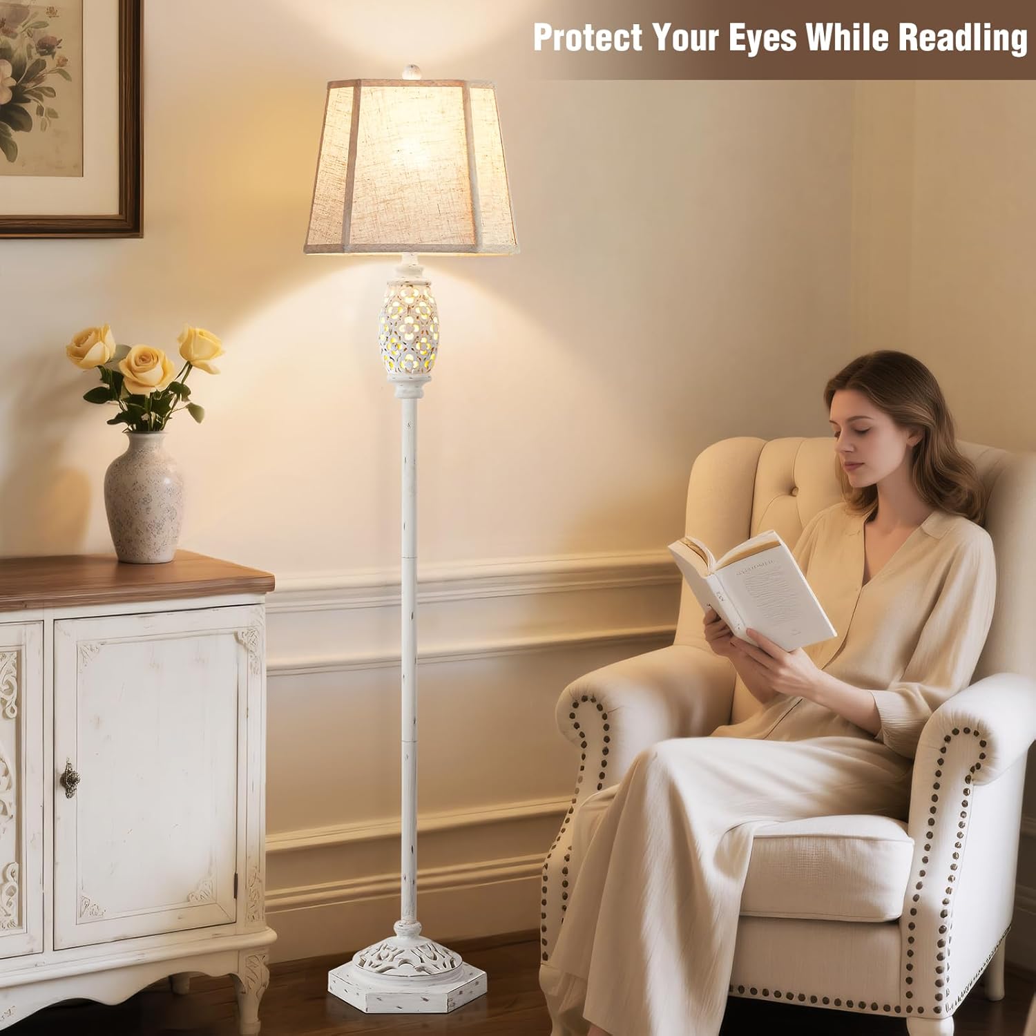 Luvkczc Rustic Floor Lamp with Floral Cutouts & Light, Vintage Farmhouse Style Standing Lamp Resin Floor Lamps for Living Room, Bedroom,Study (Bulb Included)