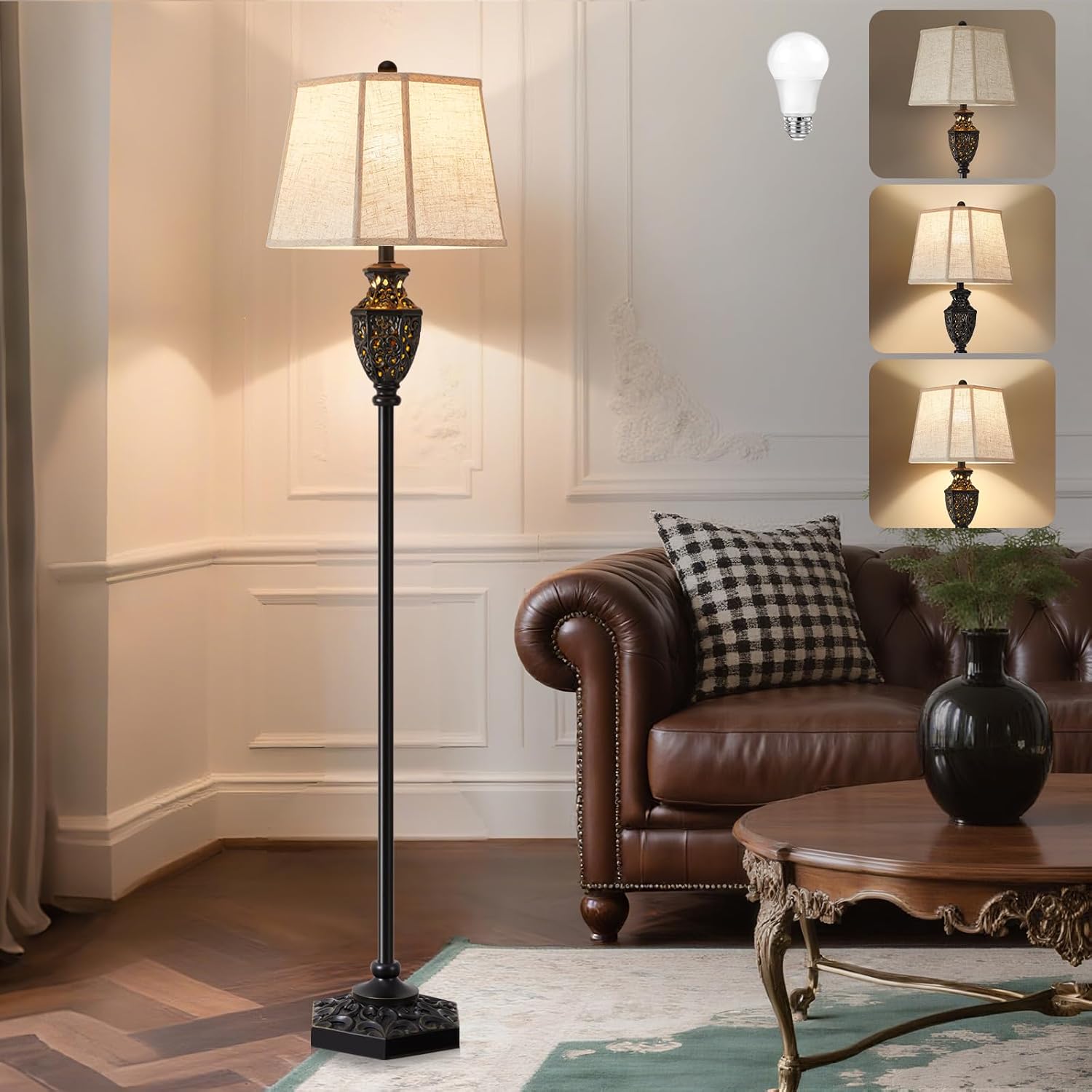 Luvkczc Vintage Black Floor Lamp - Hand-Painted Gold Resin with 6-Sided Carved Hollow Nightlight, Traditional Standing Lamp for Living Room, Bedroom, Study (Bulb Included)