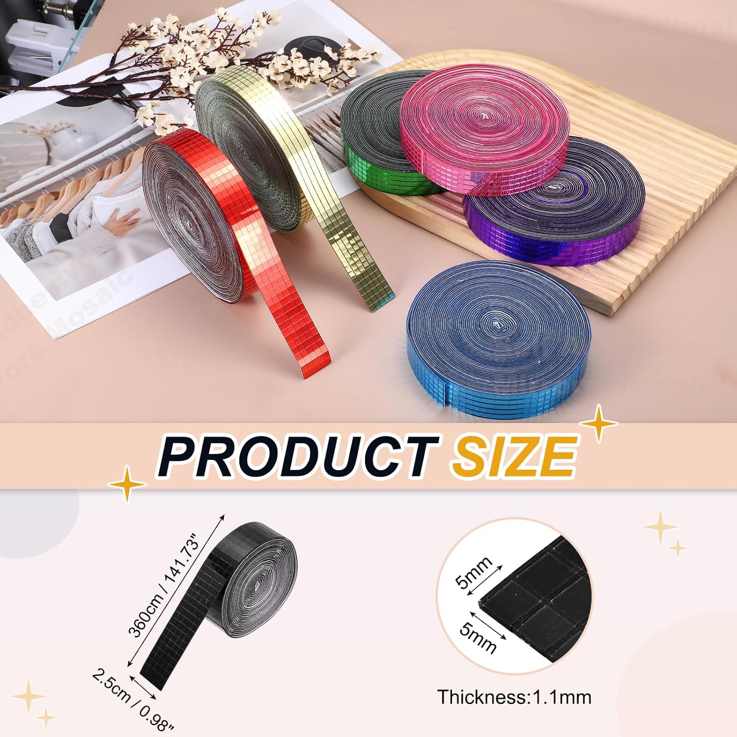 - Specification: Color: Black; Material: Glass; Size:360x2.5cm/141.73x0.98Inch(LxW); Thickness:1.1mm/0.04inch; Each Tile Size: 5x5mm/0.2x0.2inch; Packing List: 3600 Pcs x Self Adhesive Mirrors Mosaic Tiles (Roll of 1)