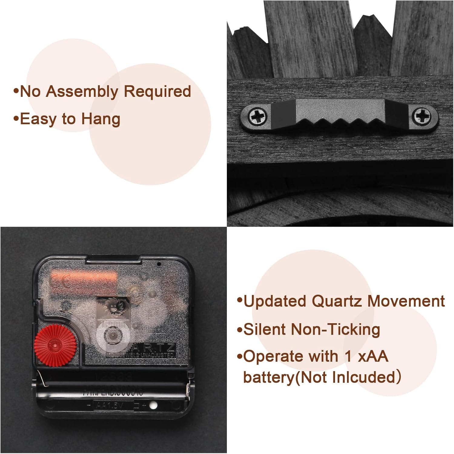 - Special Feature : Silent Clock, natural solid wood & no need assembly, wall decor