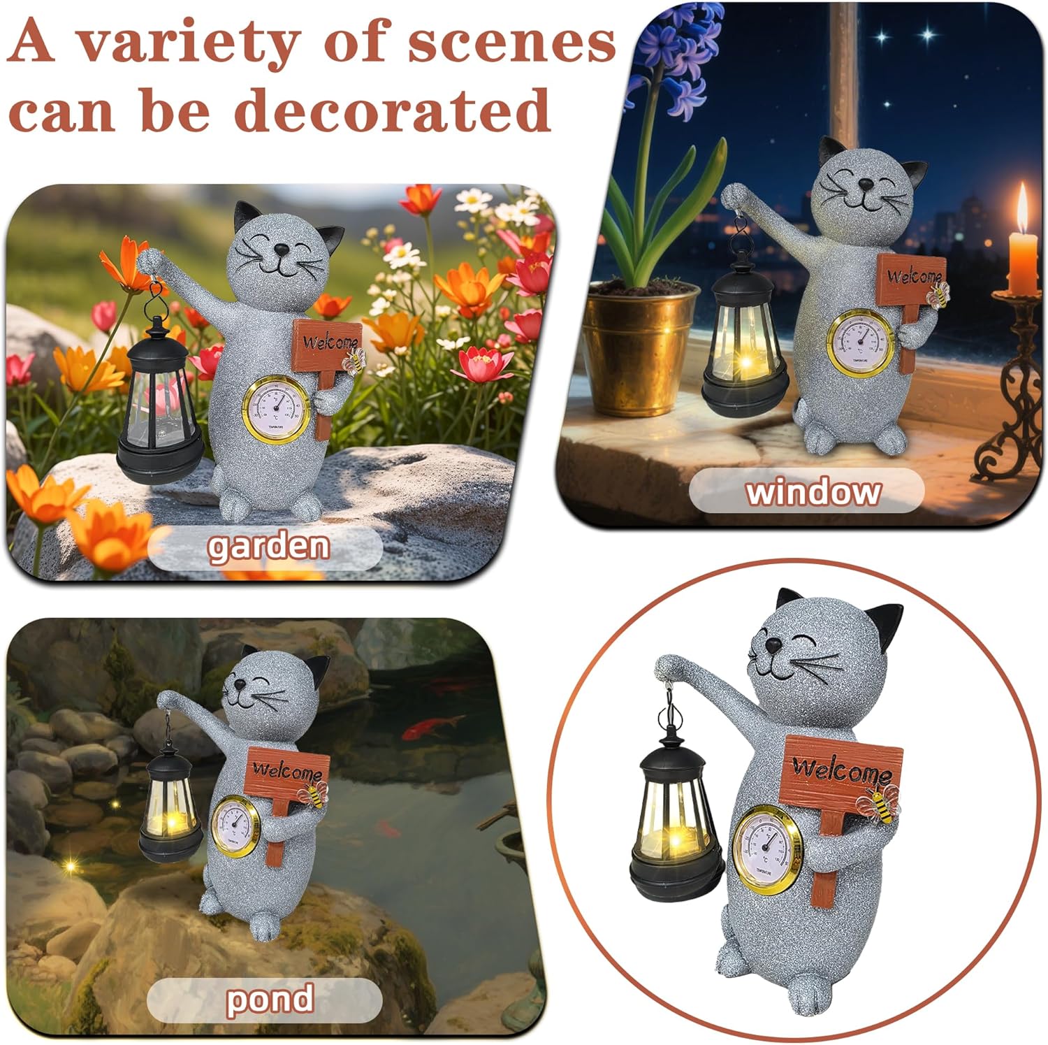 Solar Cat Outdoor Statues for Garden-Creative Thermometer-Lantern-Welcome Sign, Suitable for Yard Art, Lawn Ornaments, Porch, Terrace, Alcove, Home, House Outdoor, Cat Garden Decoration