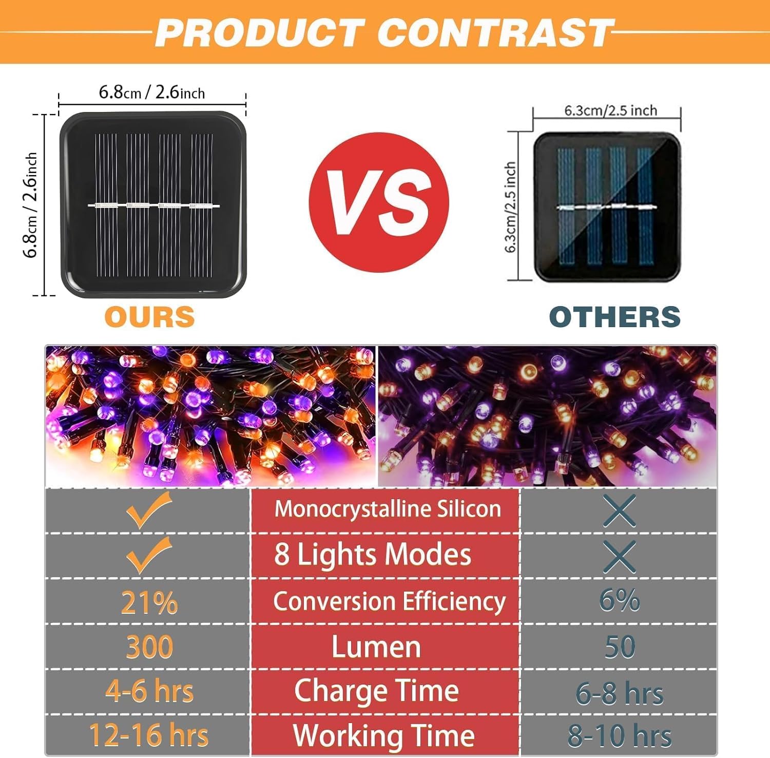 - 【Advanced Monocrystalline Silicon & IP65 Waterproof Level】Solar lights outdoor use more advanced monocrystalline silicon solar panels, which can receive, store and release solar energy more efficiently, and the solar energy conversion rate has increased by 21%. This means charging time is only 5-6 hours and battery life is up to 10-12 hours. The solar string lights outdoor waterproof up to IP65 waterproof rating, no need to fear any weather!