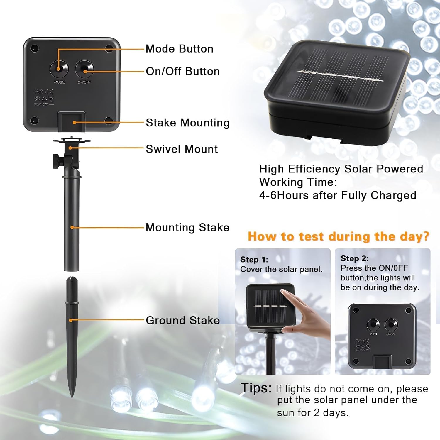 - 【400 LED Solar String Lights - Meet All Kinds Of Decorative Needs】4 strings of solar lights outdoor ( each string with 39ft, 100LEDs), total length 156 feet, total 400 LED lights. Adopting low heat generation lamp beads, it greatly improves the service life while reducing power consumption, and can meet your decorative needs.