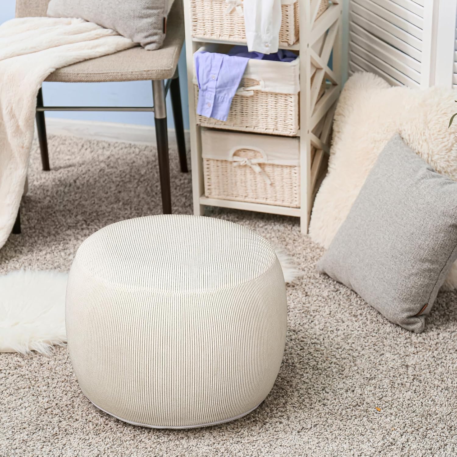 2 Pack Round Inflatable Pouf Ottoman Foot Rest for Couch 20 x 16 Inch Cozy Portable Floor Corduroy Poufs Foot Stool Ottoman with Pump for Living Room Bedroom Chair, Beige