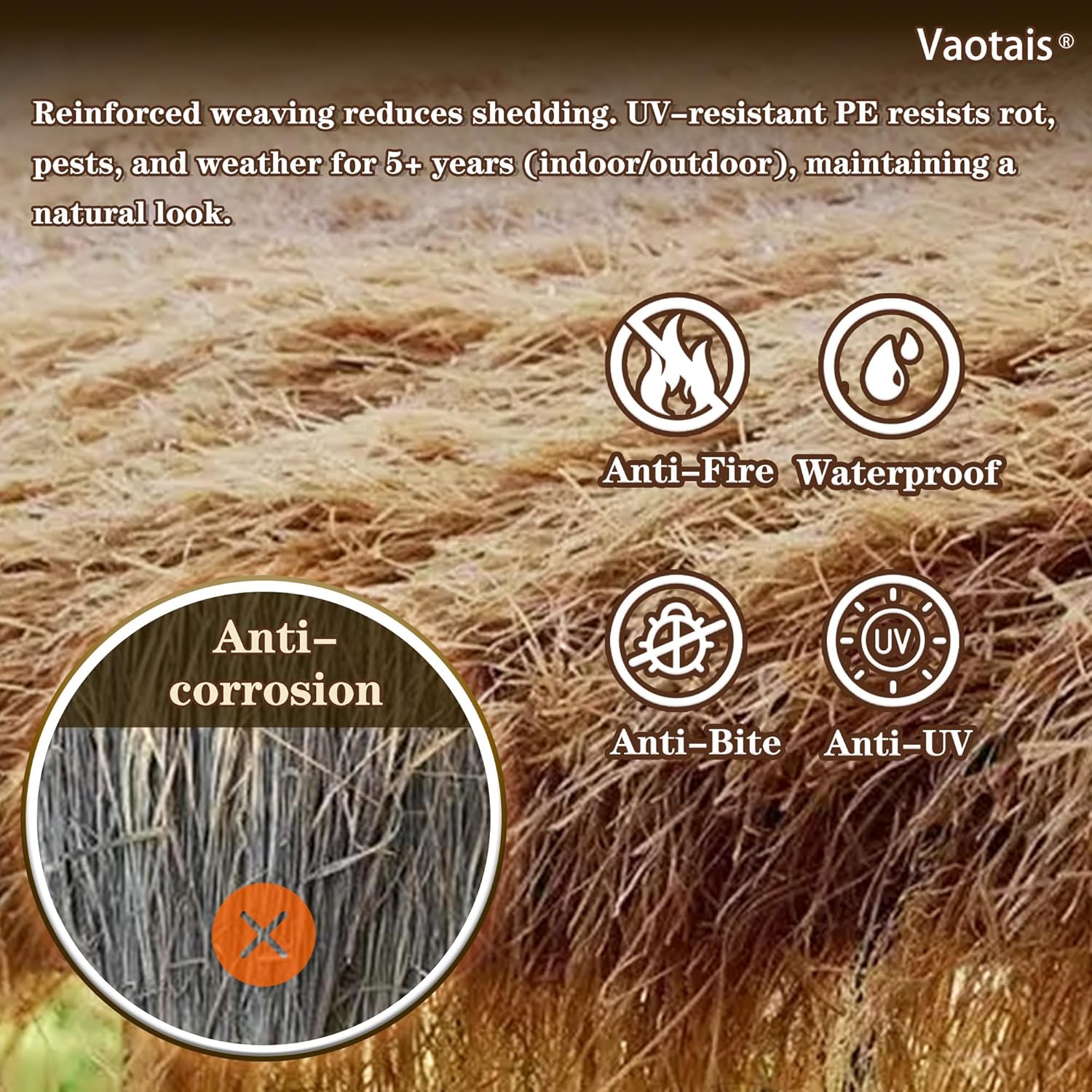 - Enhanced Durability: Our thatch features reinforced weaving to significantly reduce shedding and debris, a frequent issue with other products. Crafted from UV-resistant PE material, it’s built to withstand rot, pests, and harsh weather—providing lasting performance for 5+ years indoors or outdoors. The durable construction ensures resilience against daily wear while maintaining a realistic, natural appearance.