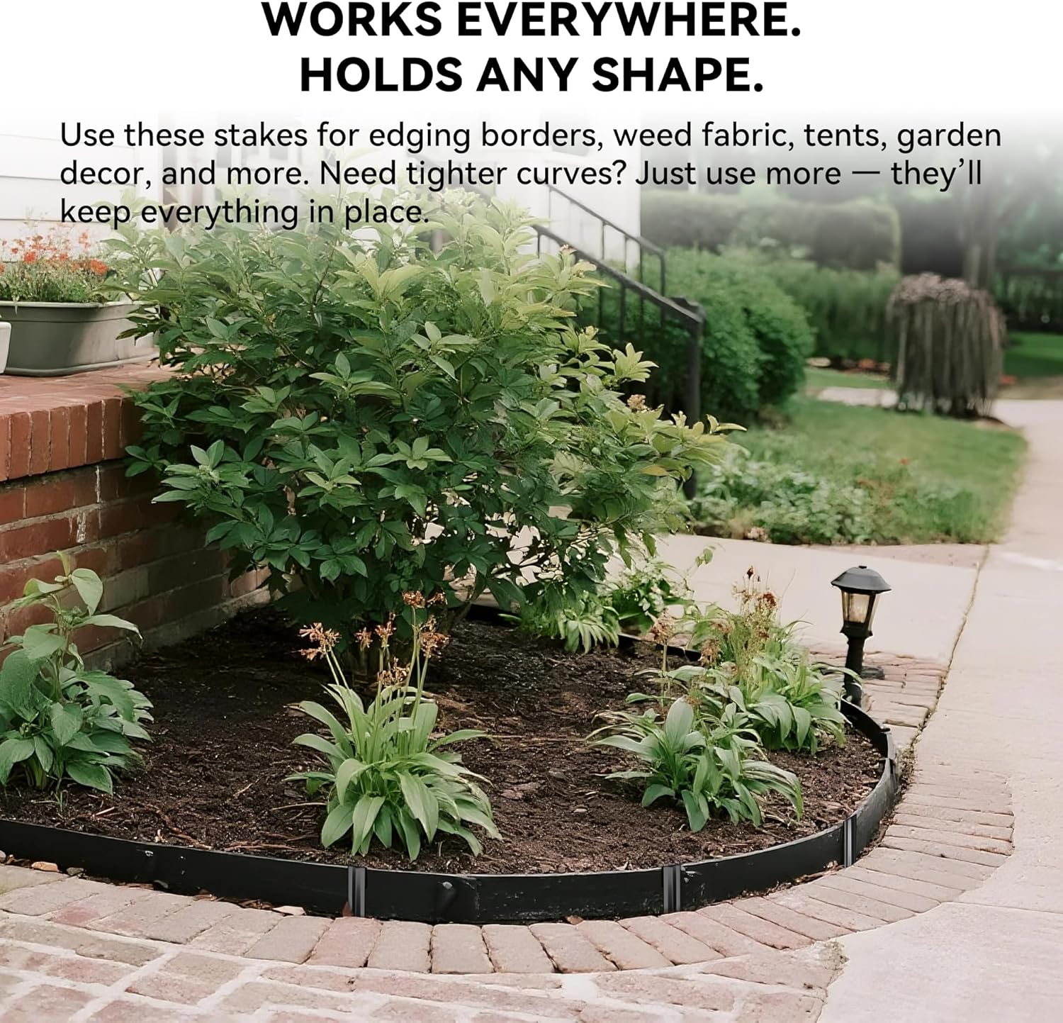 - INNOVATIVE DESIGN: Features a curved shape, the top of landscape edging stakes fits perfectly with edge to provide a stable support.The unique reinforcing rib in the middle significantly enhances the overall strength of the stake, easily solving the problem of looseness.