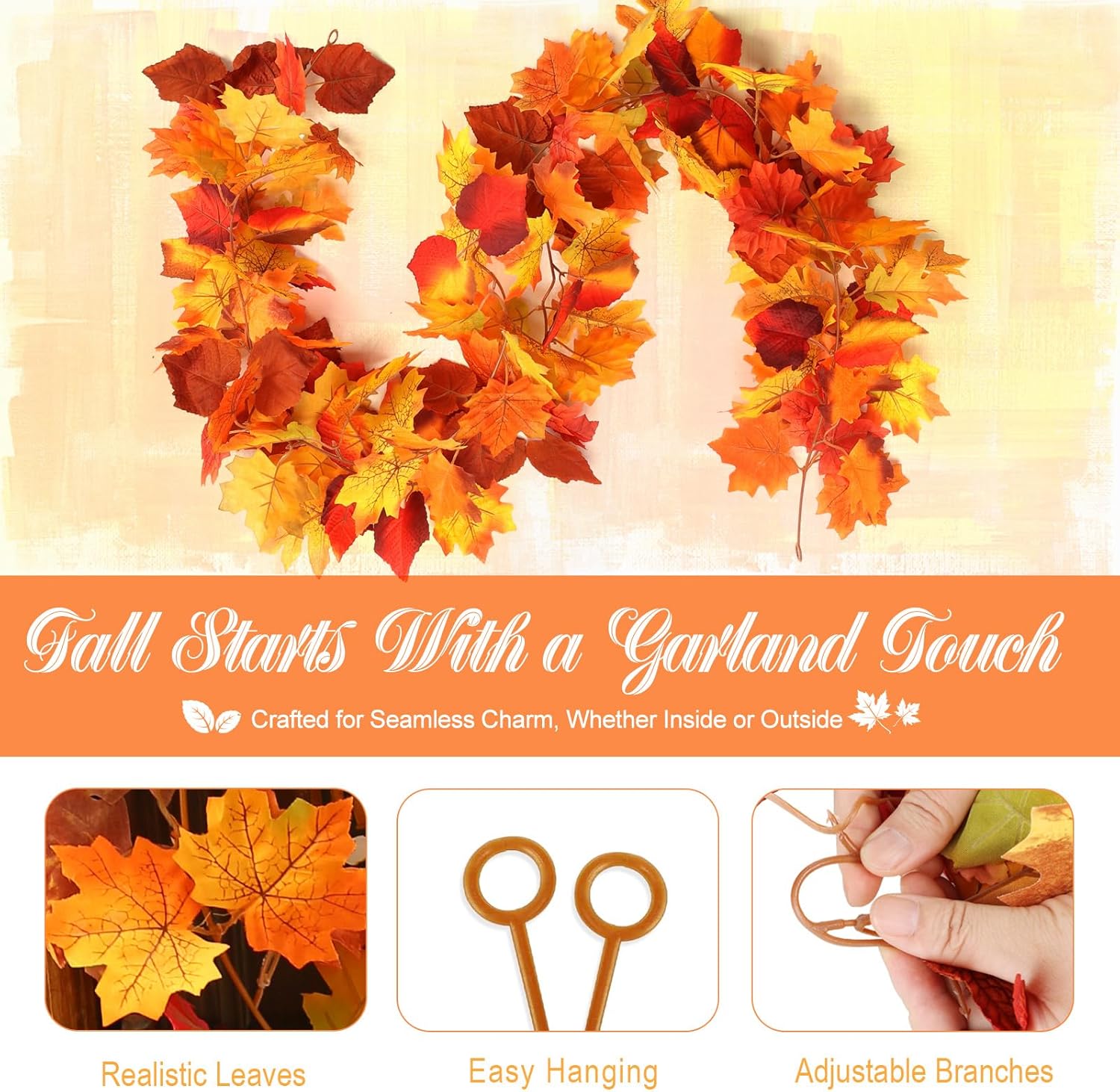 - Premium Materials: Our fall garland is crafted from silk clothes.Equipped with 2 hook accessories for easy hanging, its flexible plastic rod allows creative shaping for fall decor. Perfect for fall outside decor, it integrates seamlessly into fall garland setups like maple leaf garland.