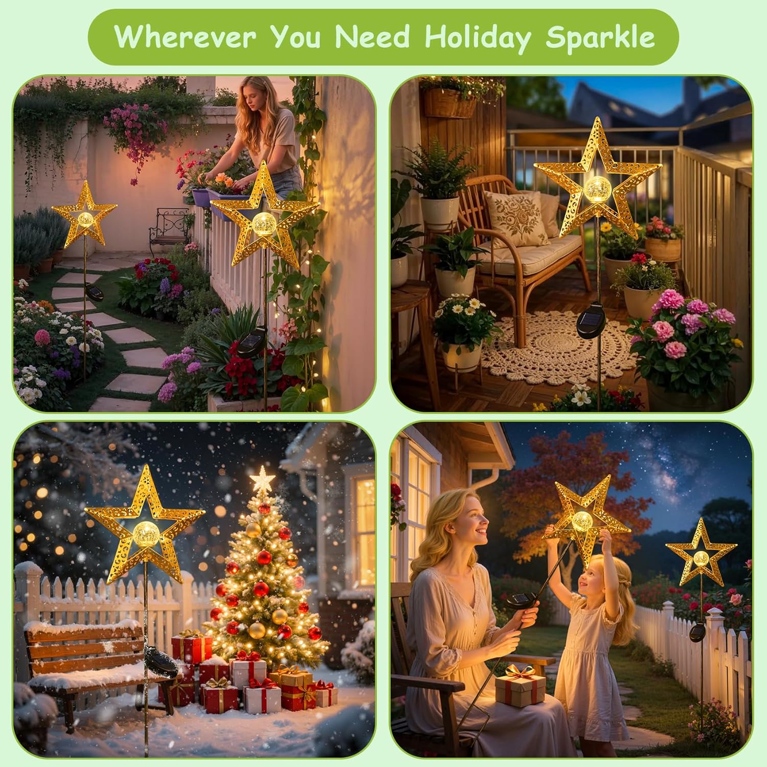- ✨ 【Eye-Catching Star Design】 – Add festive charm to your yard with these solar star lights for garden! The elegant 5-point star shape creates a warm, magical glow, perfect for Christmas decorations outdoor, parties, or year-round landscaping.