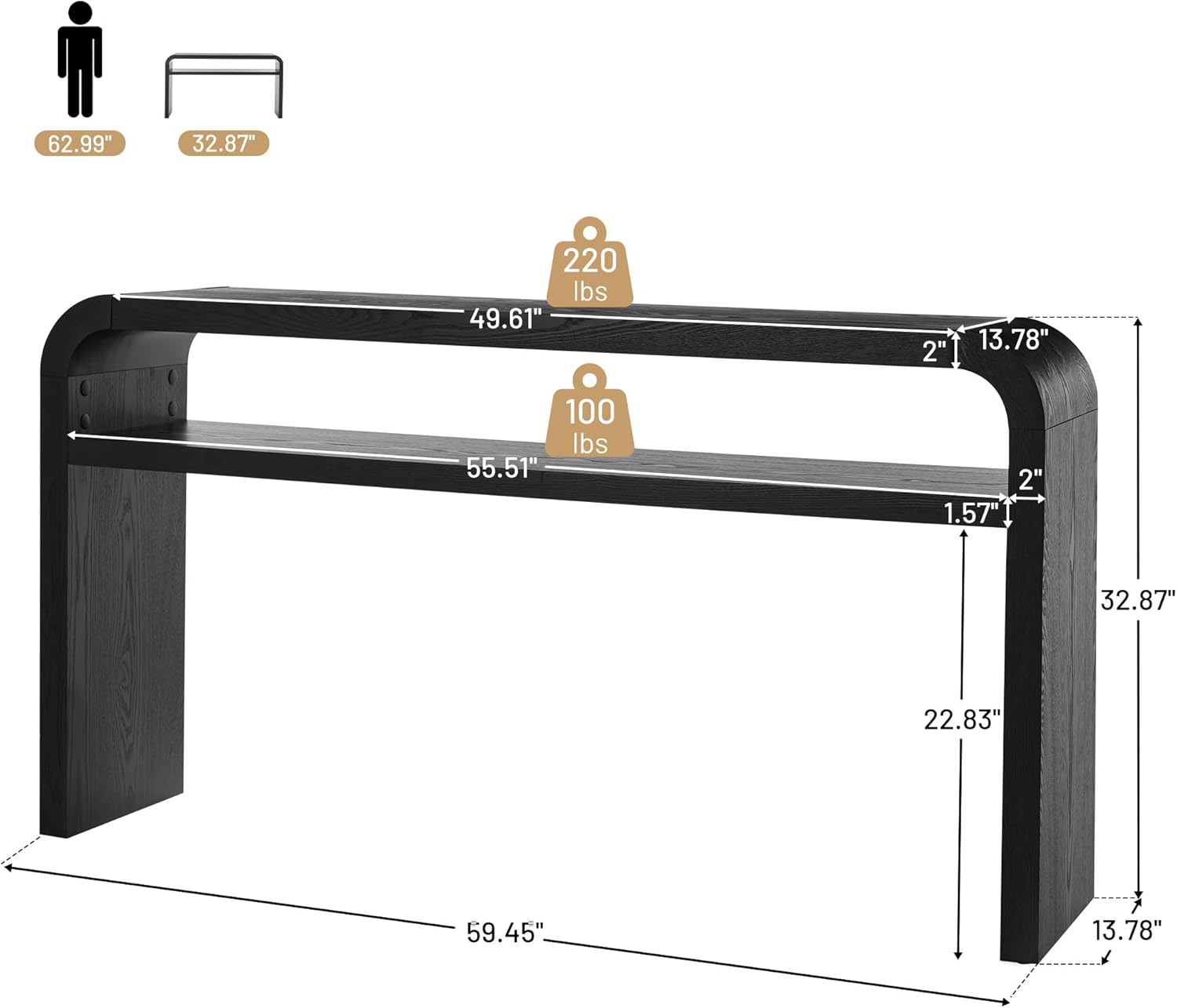 - 【Extra-long Dual-Layer Design】- At 59.45" long, this large black waterfall console table fits perfectly in narrow spaces. The open dual-shelf design provides ample storage while blending seamlessly into your home