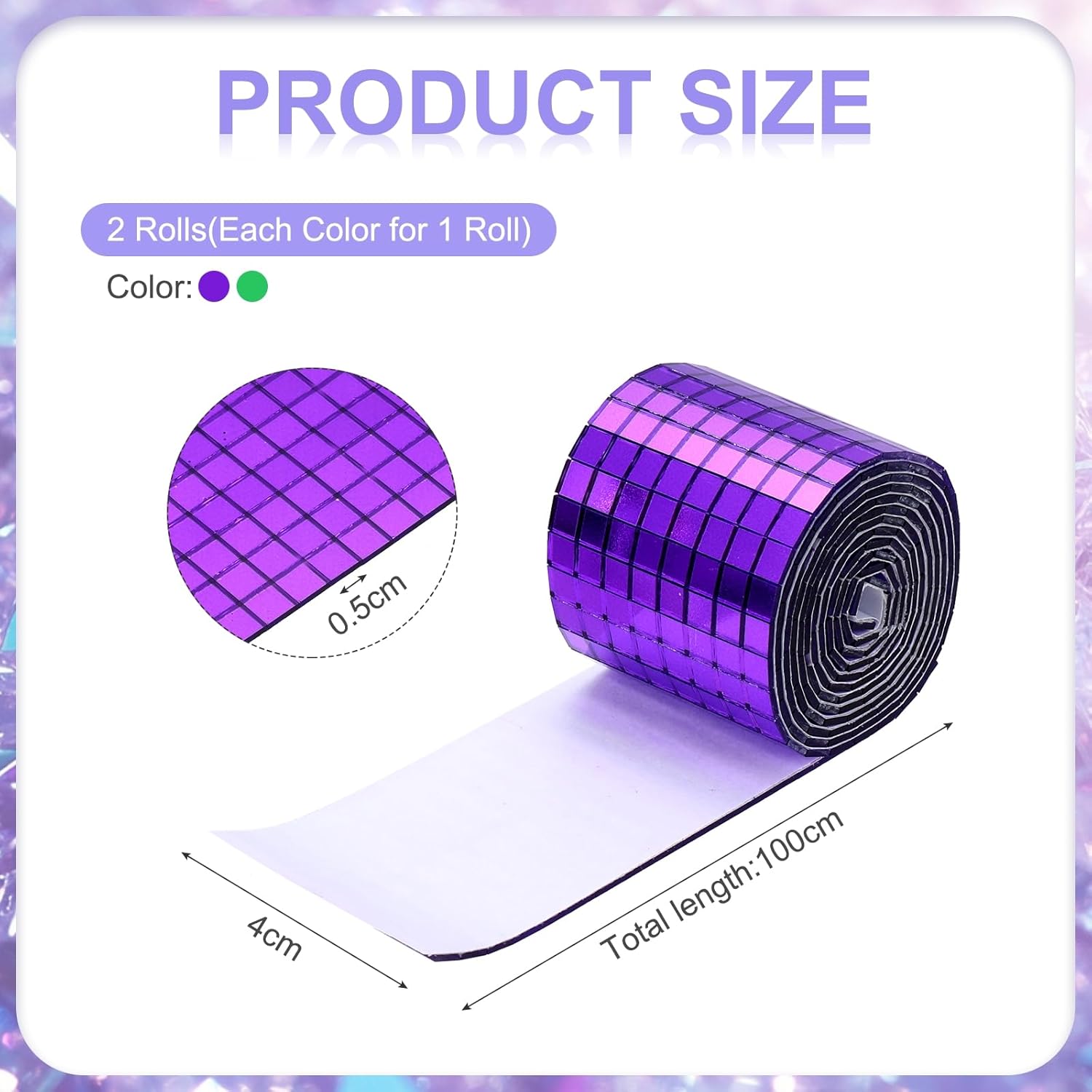 - we provide here, are in the size of: Size: Each roll measures 4 x 100cm (total 2 meters) ; Material: glass with strong adhesive backing ; Color: 1 roll of Purple + 1 roll of Green (total 2 rolls) ; In the package of: 3200 Pieces Adhesive Mosaic Tiles 5 x 5 mm Disco Tiles 2 Rolls (Purple & Green)