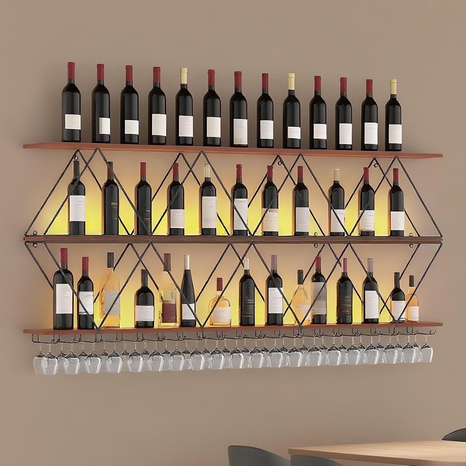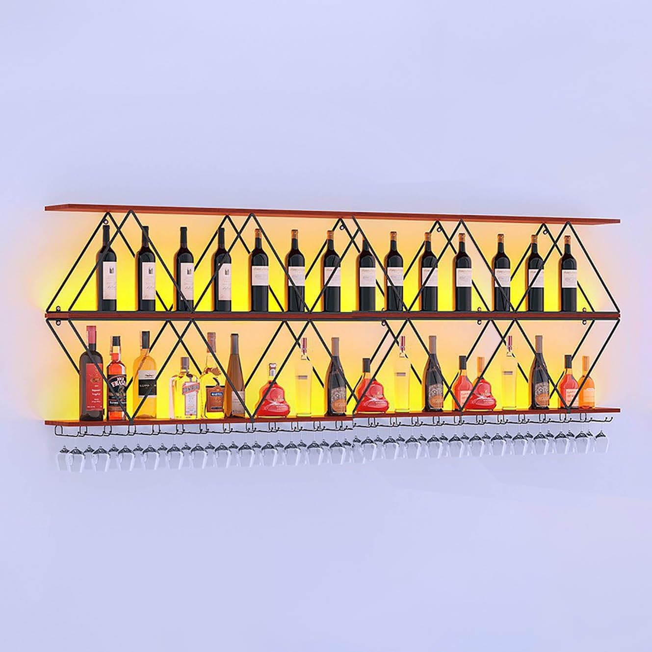 - Multi-function: Well-designed wine glass rack for wine glasses and free placement of wine. This wall-mounted wine rack can not only store wine bottles, but also other items to make your space more sophisticated.