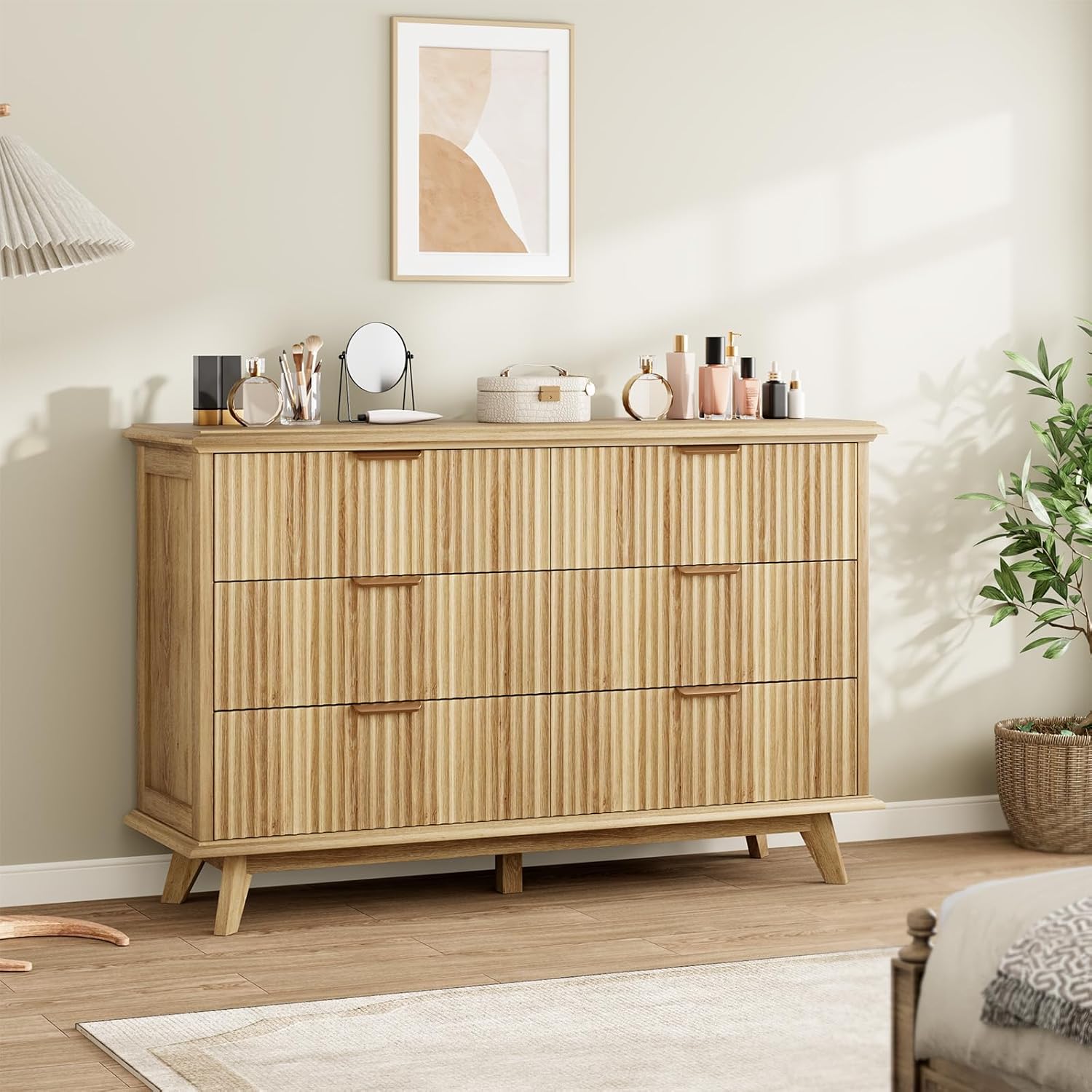 QUW Fluted Dresser for Bedroom with 6 Drawers, 47.2" Wide Modern Chest of Drawers with Metal Handle, Wooden Dresser TV Stand and Closet Clothes Storage Organizer for Living Room, Hallway, Natural Oak