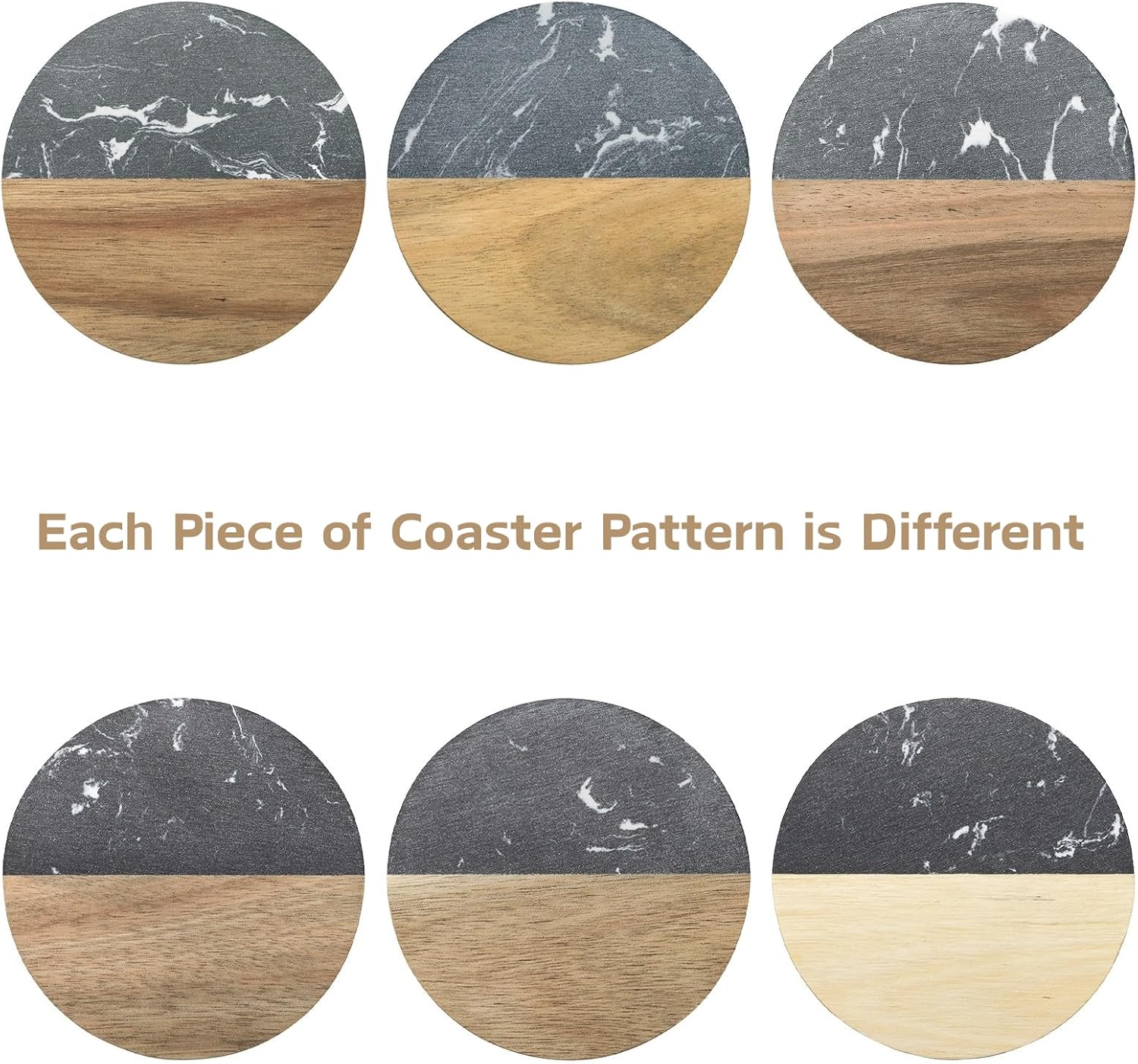 - Package and Size: Our product includes 6 packs of marble and wood coasters, each coaster measures 3.9 inch diameter and 0.4 inch thick, perfect size for setting hot drinks like hot coco, tea, coffee, or cold beverages like cocktails, wine, beer, etc.