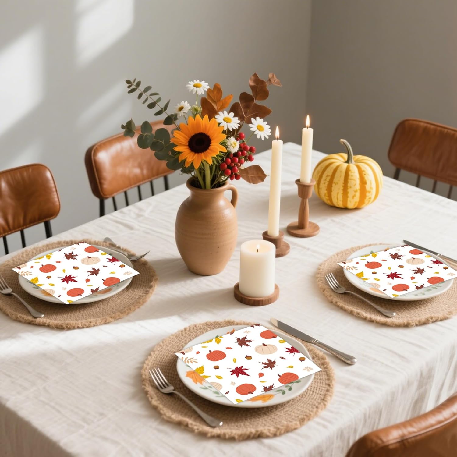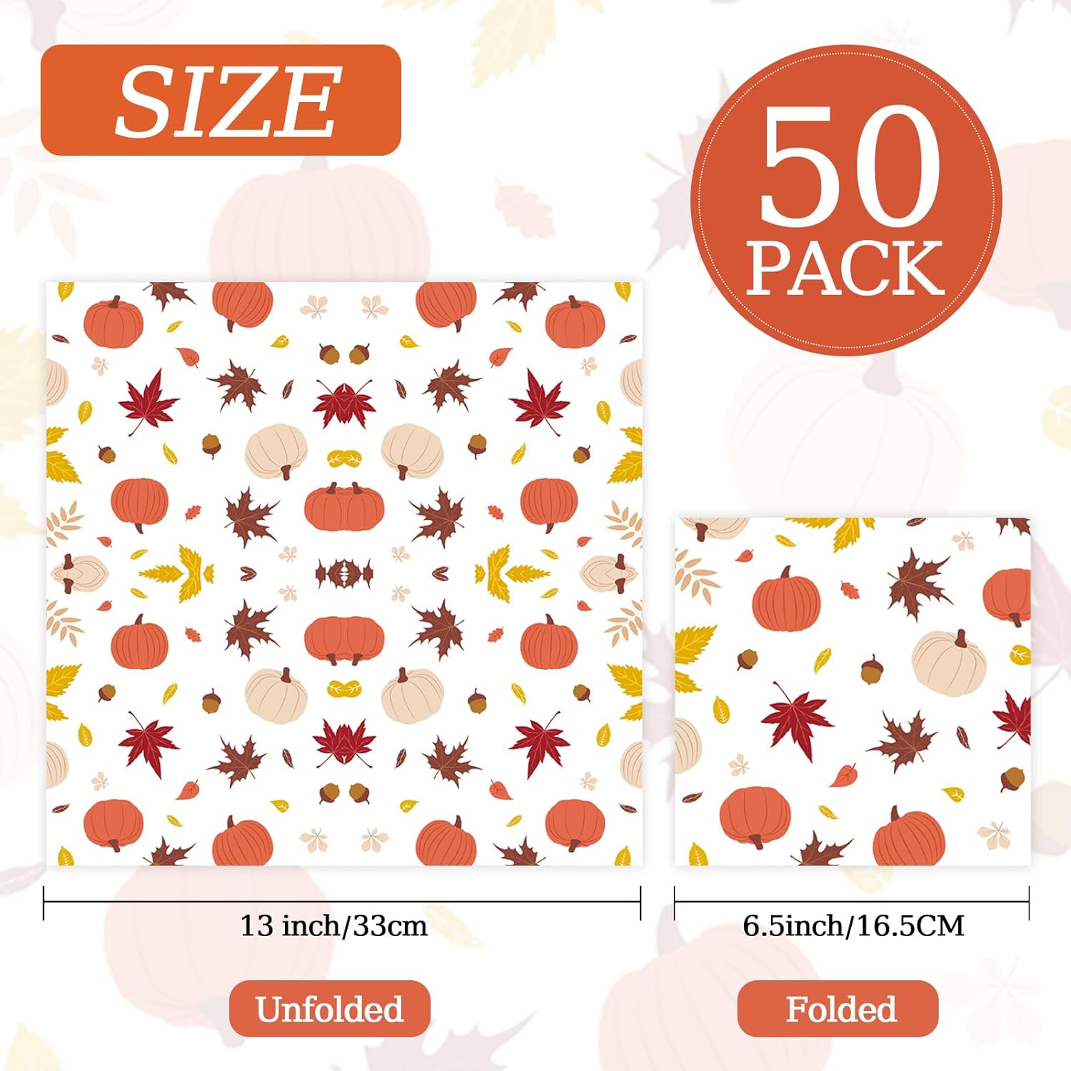 50 Pcs Fall Napkins 5 x 5 inch, 3 Ply Pumpkin Maple Leaves Paper Napkins Disposable Holiday Cocktail Napkins for Dinner Bathroom Autumn Thanksgiving Party Decorations (Fall)