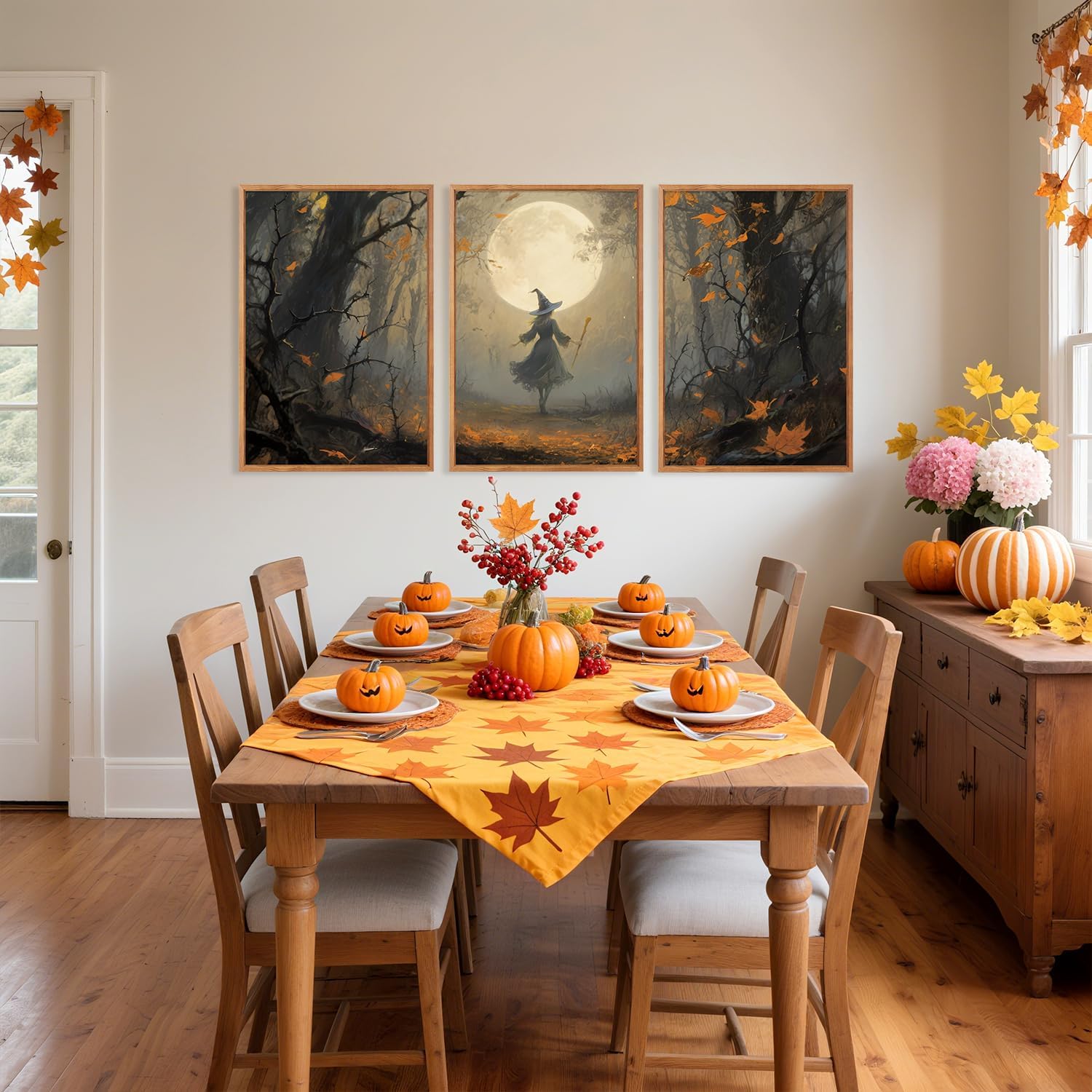 Aurlan Moonlight Witch in The Maple Forest Framed Wall Art(16"x24"), 3PCS Vintage Magical Witchy Gothic Halloween Canvas Artwork, Dark Academia Mystical Midnight Landscape Decor for Home Office Bedroom