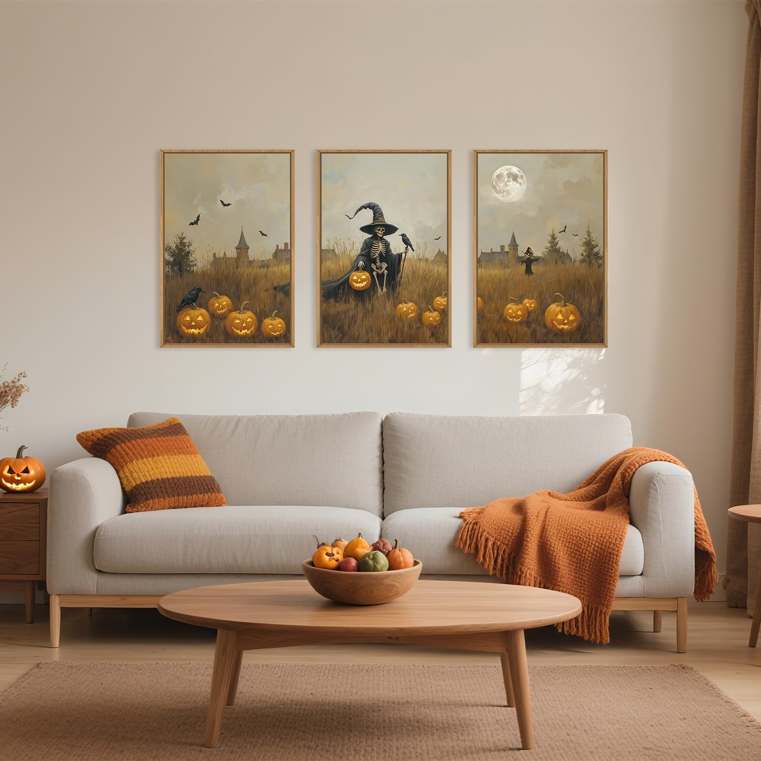 - [Halloween Ghost Reaper Framed Wall Art Set] This halloween chost reaper canvas wall art set uses evil pumpkins and witches to create the atmosphere of a terrifying night. It is modern festive vibe reminds people of the charm of Halloween. Using these artworks as part of the decoration will fill your living room with a festive atmosphere.