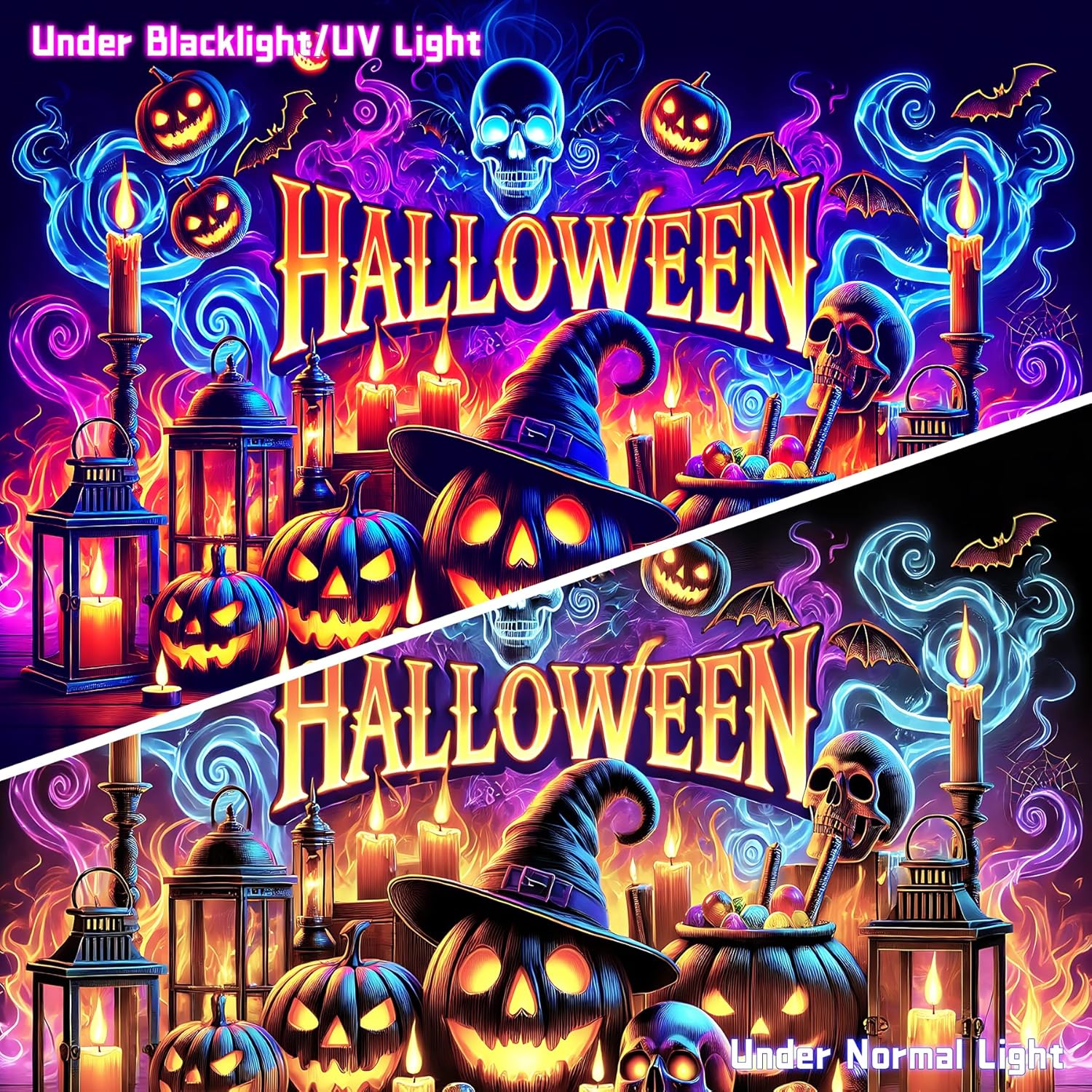 - 【Instant Halloween Vibes】Features UV-reactive designs like skeletons, ghosts, pumpkins, and cobwebs to transform any space into a haunted realm. No assembly required—just hang and haunt!