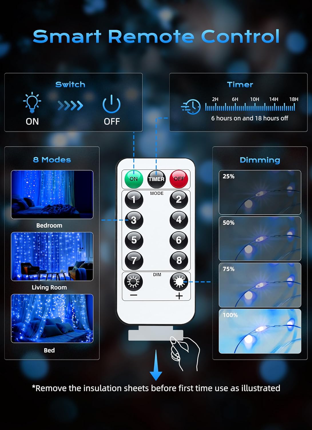 - [Timer & Remote] We can use the remote control to timing for 6 hours on and 18 hours off. What's more, the brightness of our curtain lights is adjustable of 20% 40% 60% 80% 100%