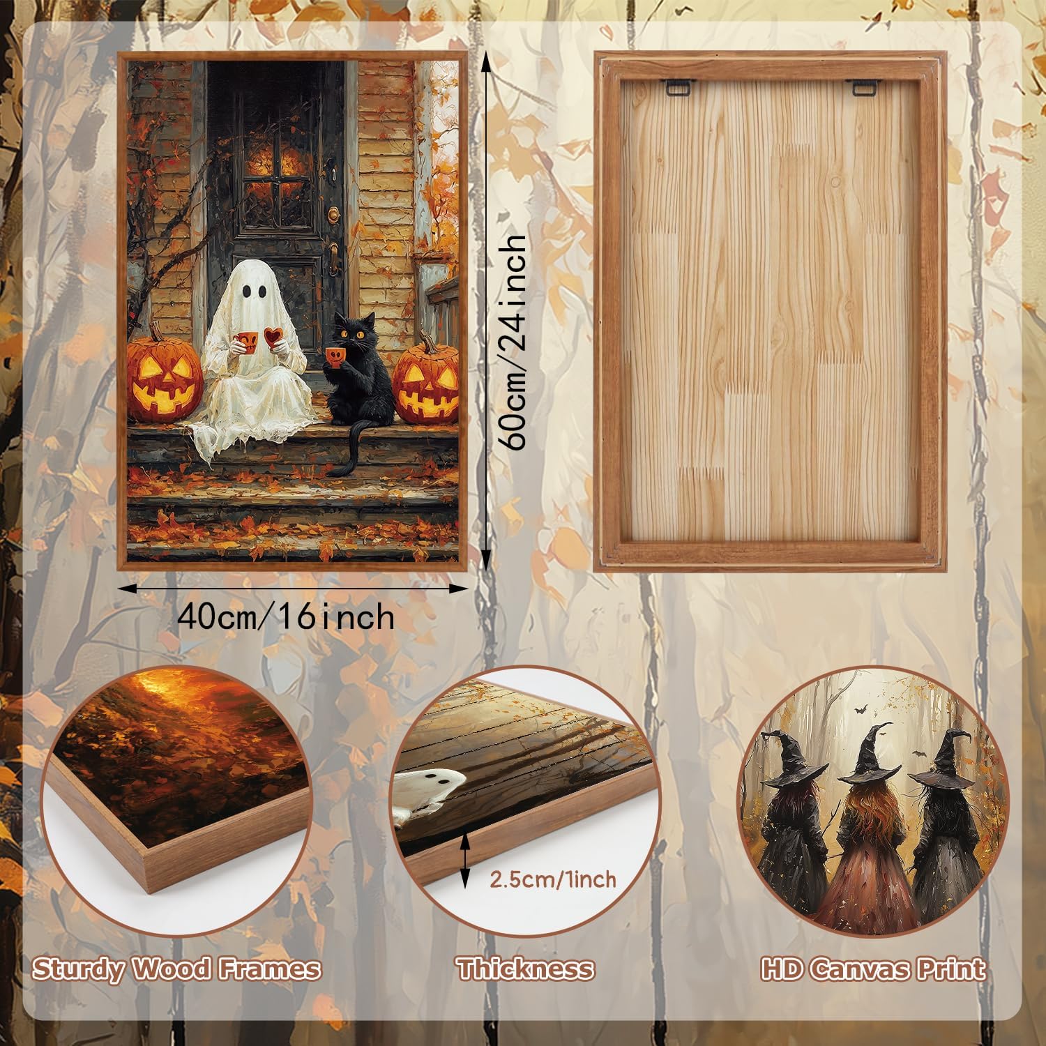- 【Horror Halloween Wall Art】Enhance the Halloween atmosphere in your home with HLNIUC Halloween Witch Ghost decorative paintings. Three mysterious witches walk towards the forest, three cute ghosts swing in the forest, a charming ghost holding a pumpkin head and a cute black cat sit in the front of the house, with two big pumpkin heads placed on both sides. Create a creepy atmosphere for your Halloween home decoration.