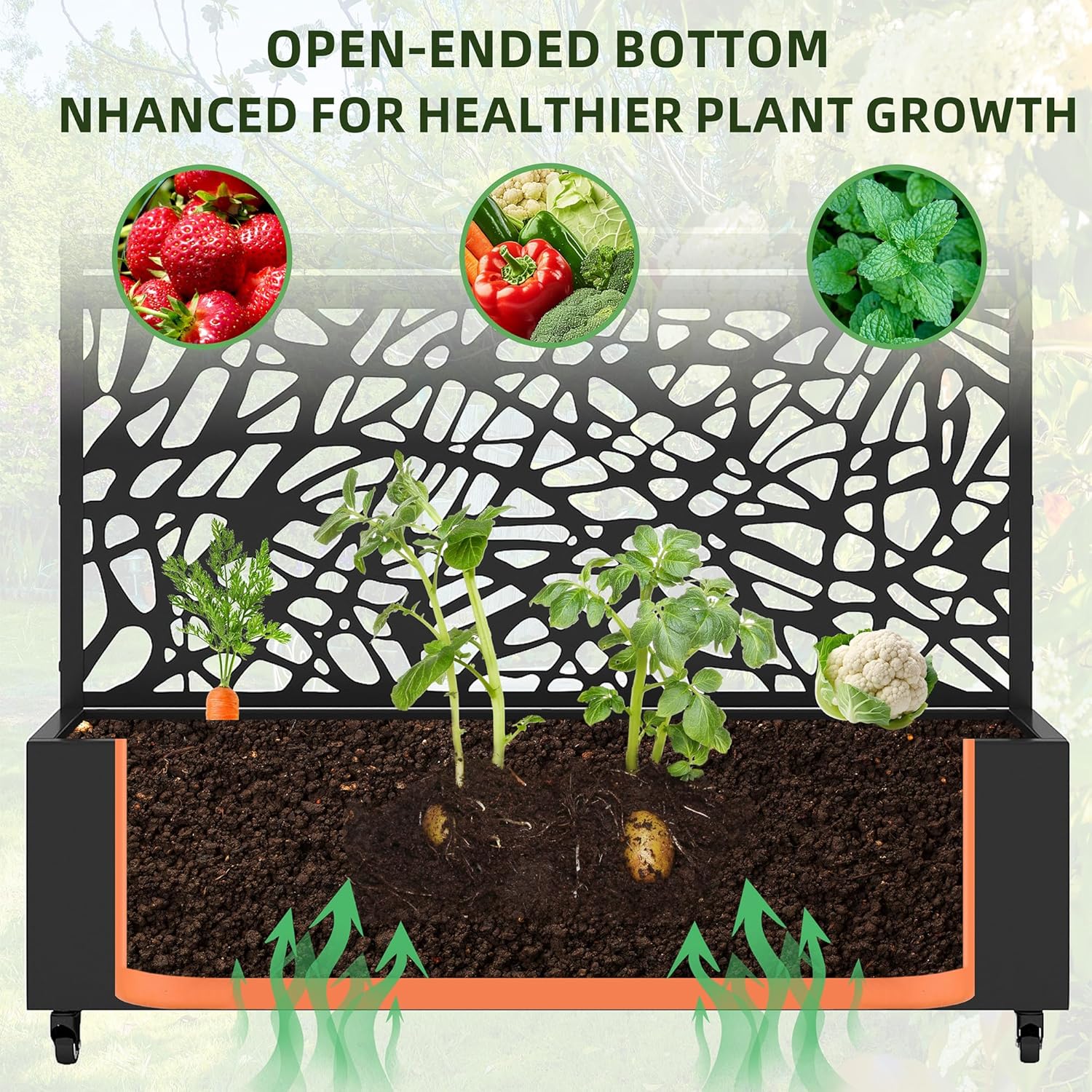 Casaphoria Metal Raised Garden Bed with Trellis and Wheels, 72"x47"x16" Planter Box for Climbing Plants, Vegetables & Vines, Features Drainage Holes and Privacy Screen, Black(Net&Helen)